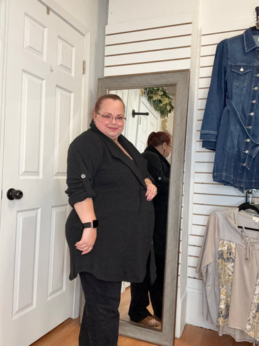 The Belinda Textured Layering Jacket in black offers a cozy and stylish solution for your layering needs. Featuring a flattering lapel collar and a tie waist, this jacket provides adjustable comfort and a tailored silhouette. Its textured fabric adds visual interest while keeping you warm, making it a versatile piece for both casual and polished looks.