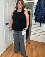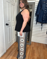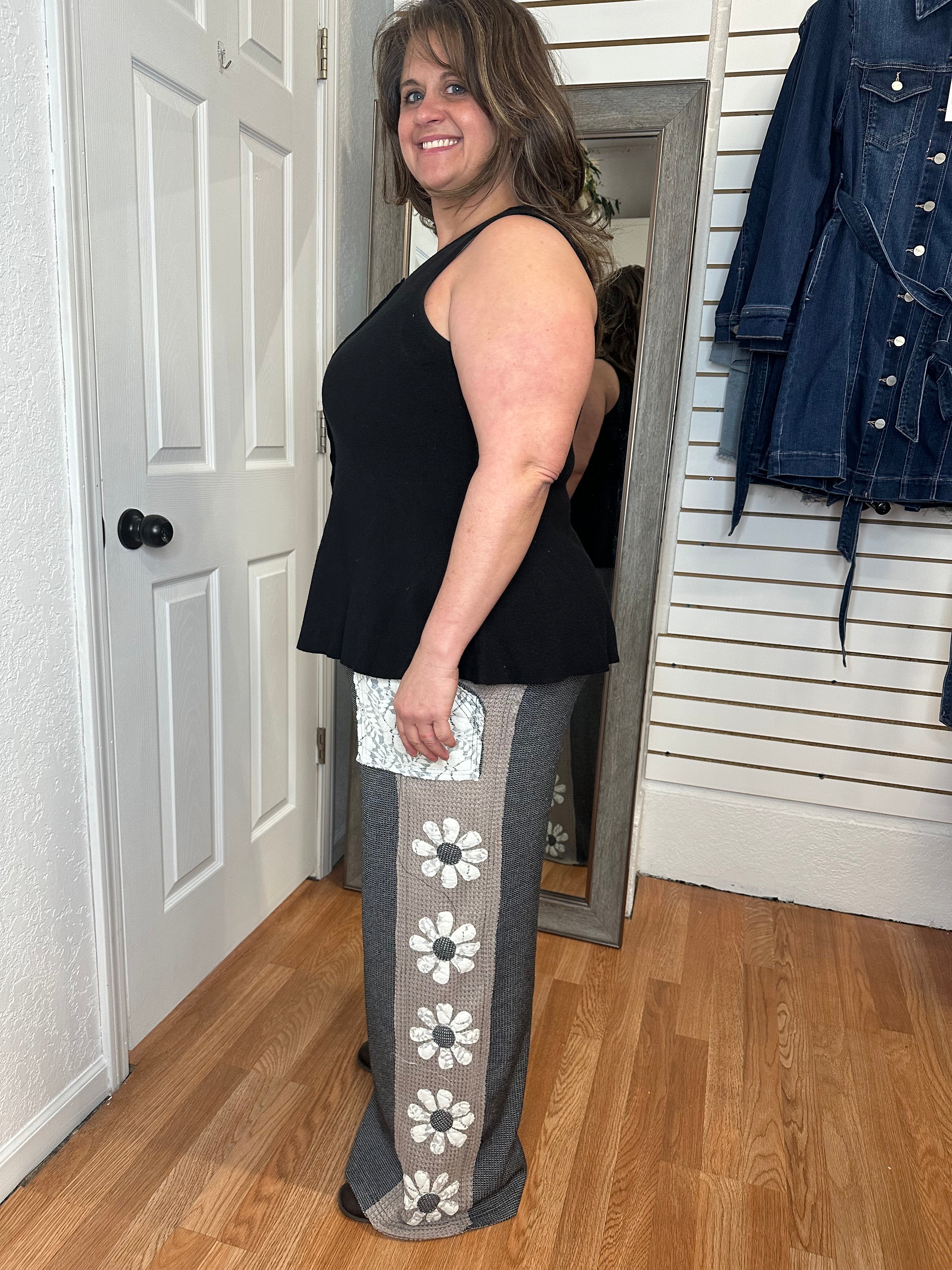 FEATURES: STRETCHY ELASTIC WAIST WIDE LEG PANTS. BLACK, TAN, AND IVORY IN COLOR. FUN FLOWER DETAILS DOWN THE LEG.