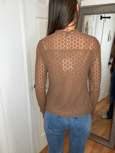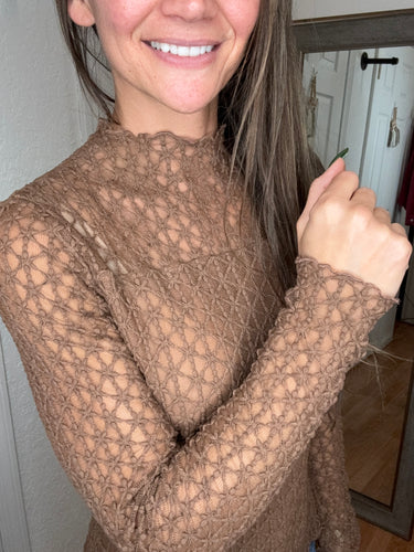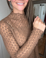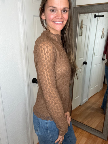 FEATURES: LONG SLEEVE LACE LAYERING TOP. RUFFLE MOCK NECK, RUFFLE TRIM ON WRISTS AND HEMLINES. LINED IN THE BODY. MILK CHOCOTE BROWN.