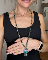 Long continuous beaded necklace featuring mixed faceted beads in green and bronze tones with a decorative fish-shaped pendant accented with turquoise-colored details. Necklace measures 18-1/2" inches in length and is finished with a lobster clasp closure. Chain: 16" Pendant: 2-1/2" Total Length: 18-1/2"