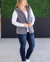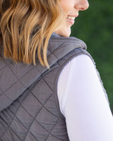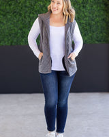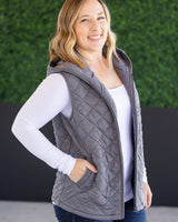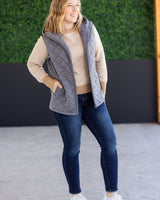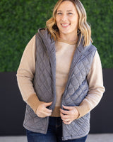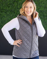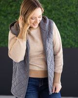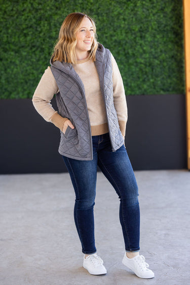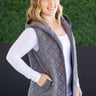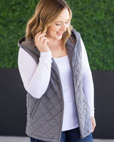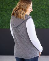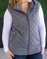 Stay cozy and stylish this fall with our hooded vest in grey. This vest features pockets and a zipper, perfect for keeping your hands warm and your essentials secure. Don't forget the hoodie for extra warmth. A must-have for any fall wardrobe. Pattern is a diamond/square design.
