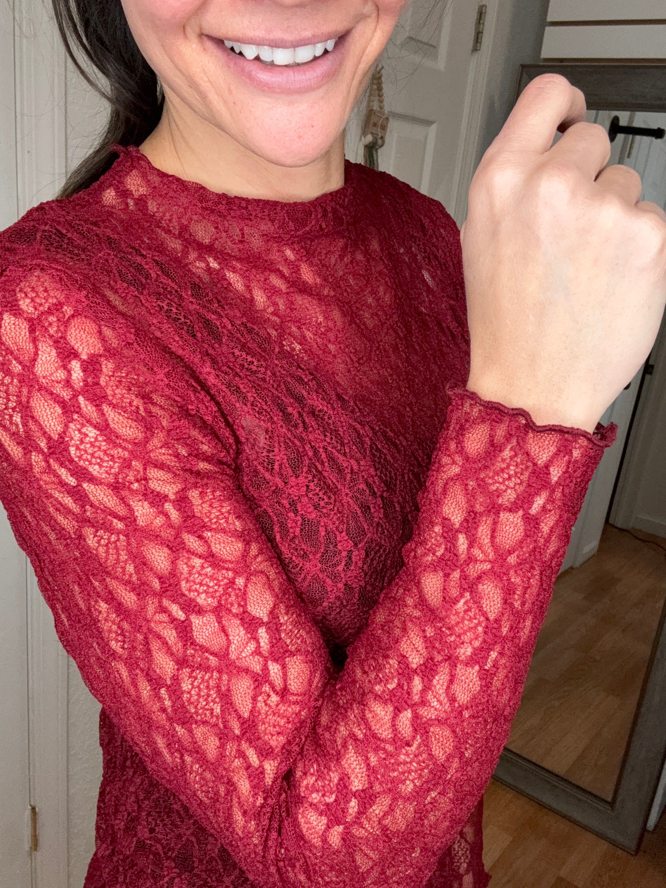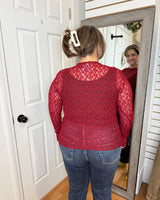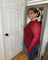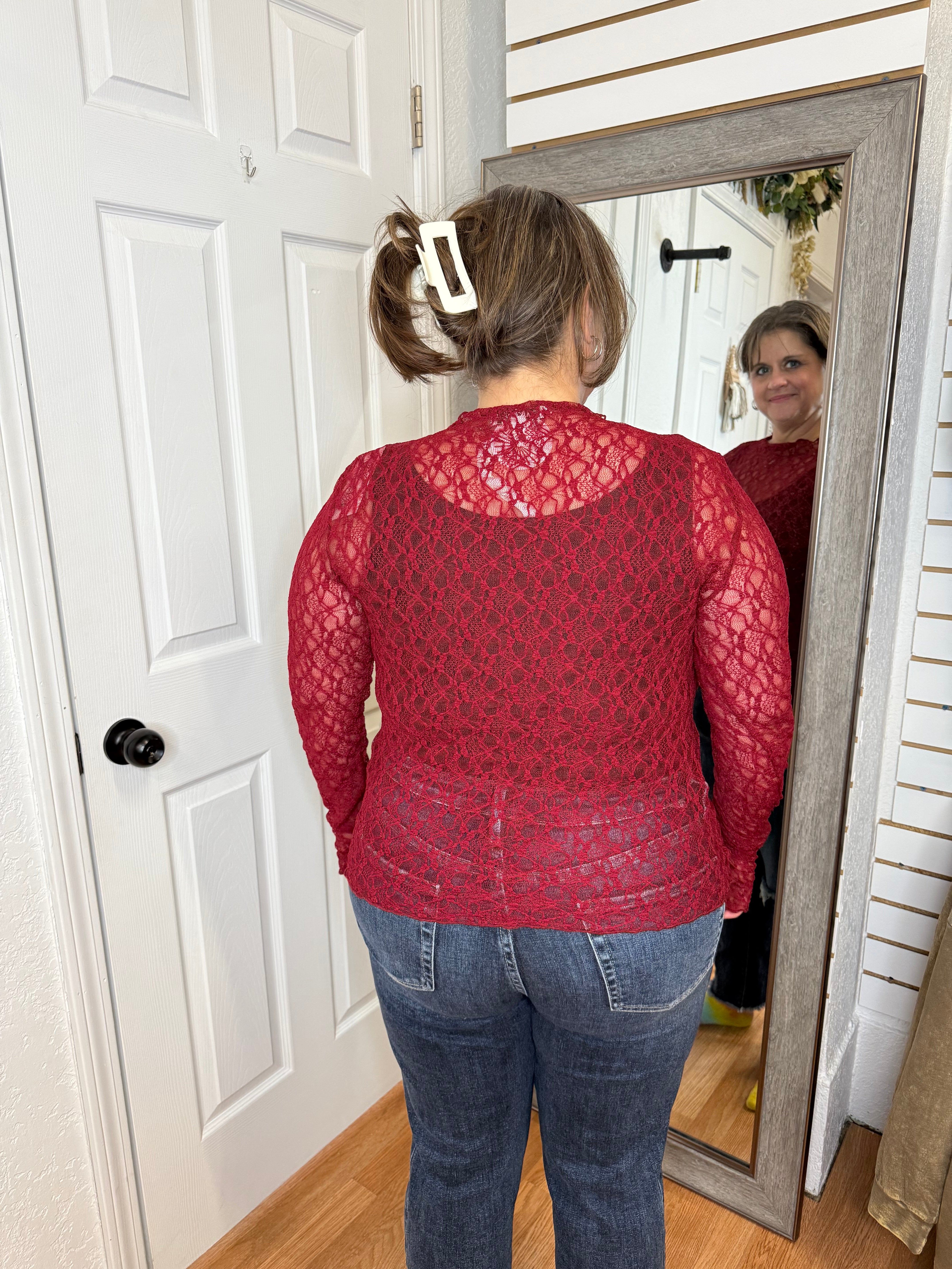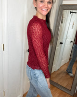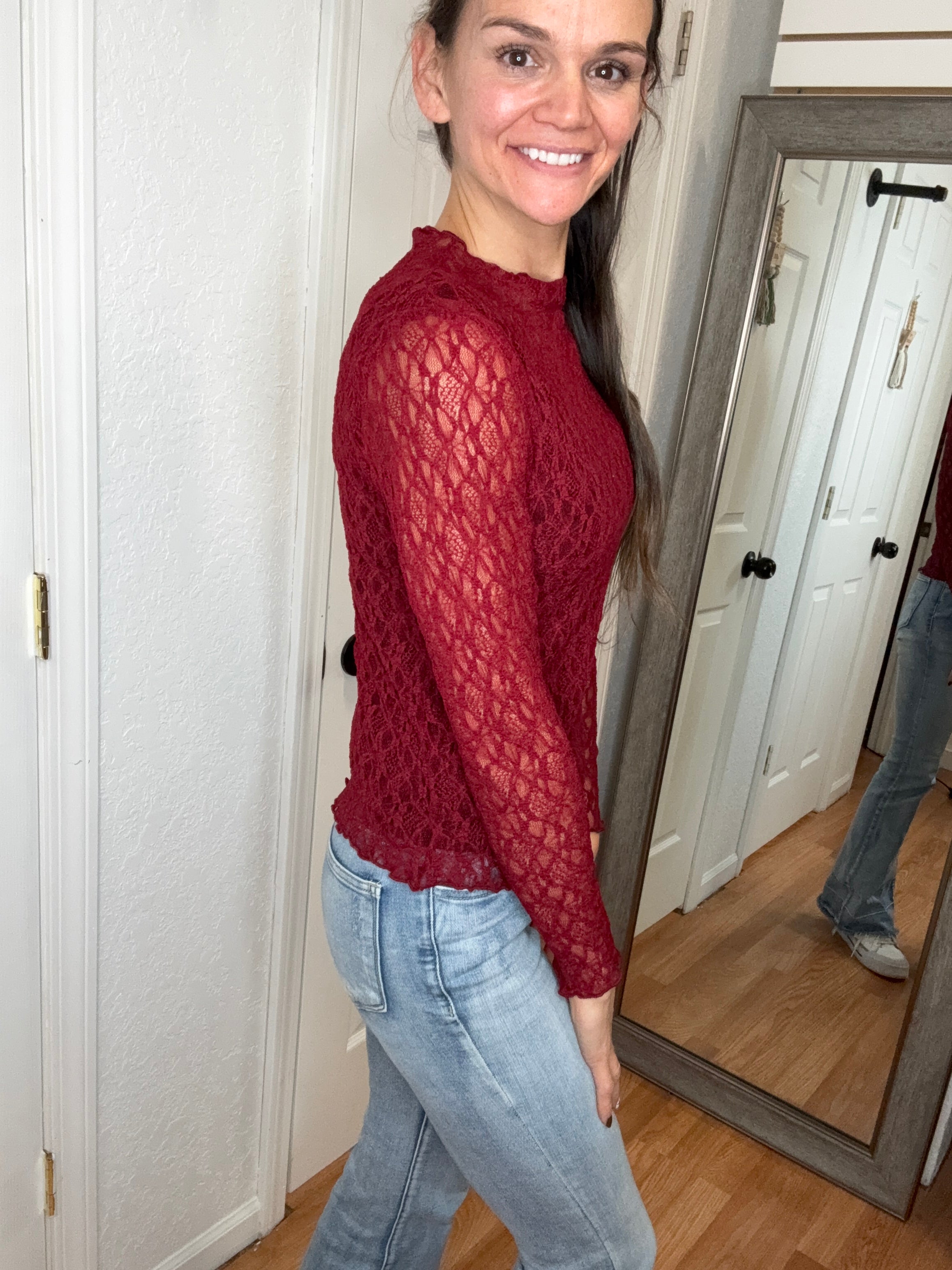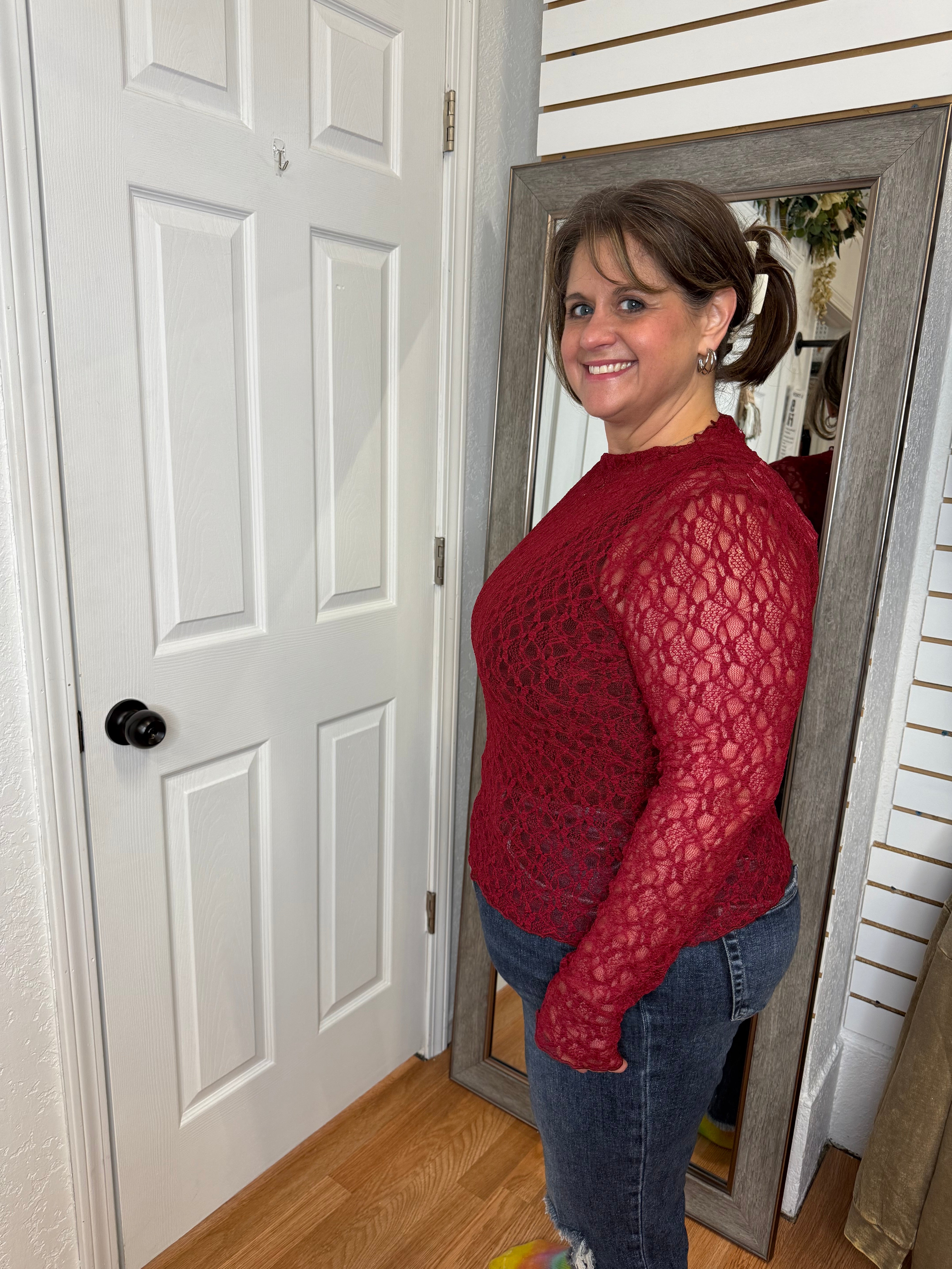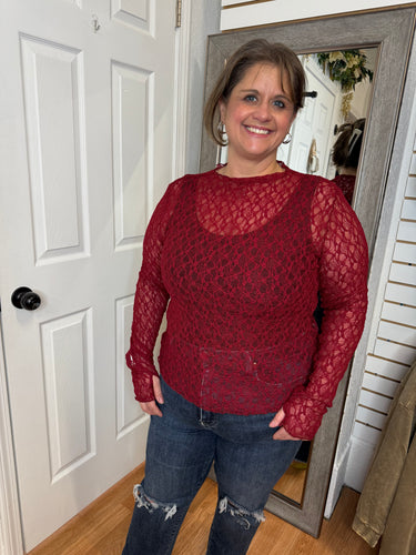 Our new lace tops are HERE!! Super cute for layering or wearing alone! SUPER soft, stretchy top features a totally sheer design. Perfect worn alone or paired under your favorite Lola cardigan, vest or sweater! Slight mock neck with lettuce trim and thumbhole detail sleeves.