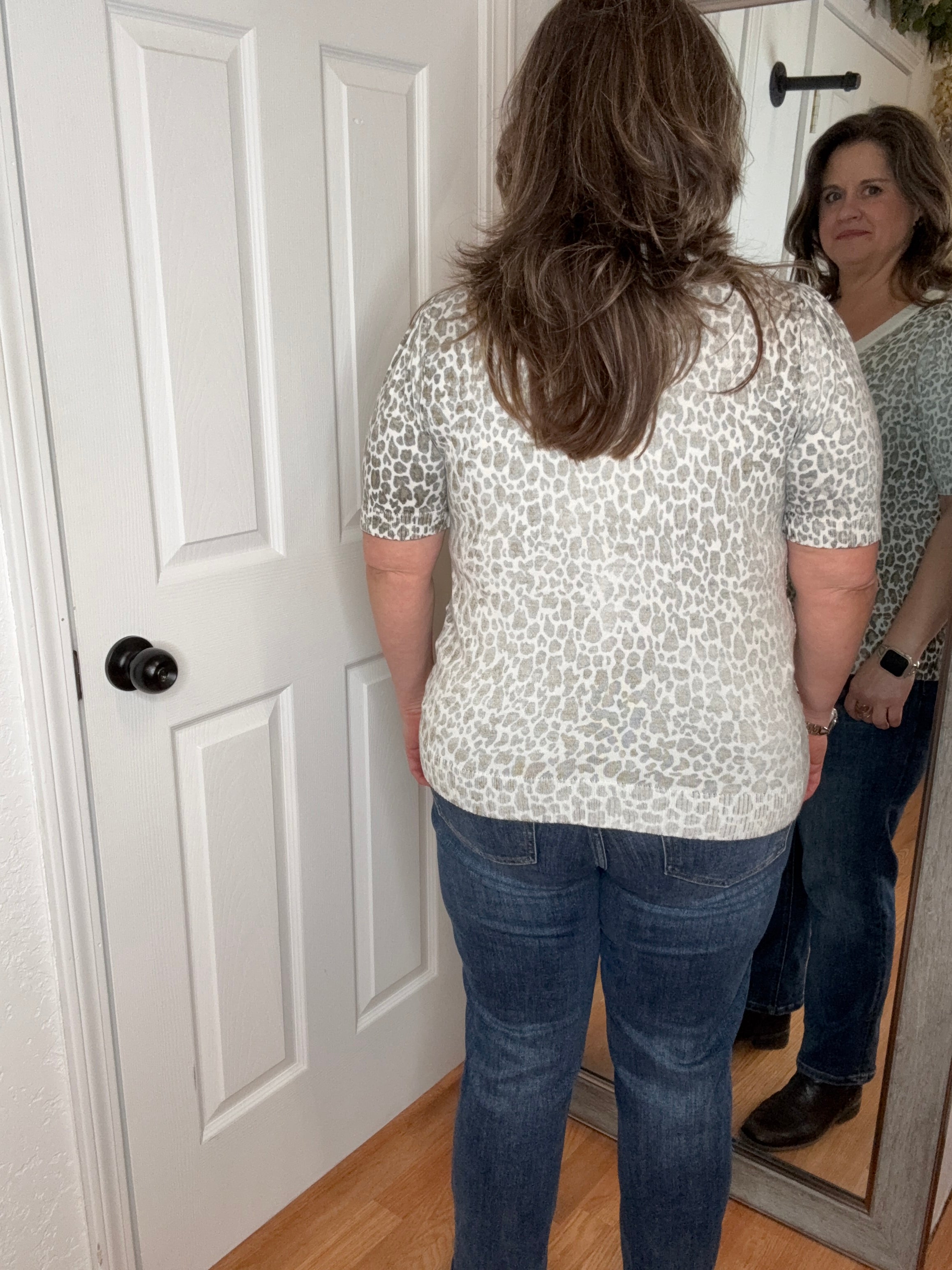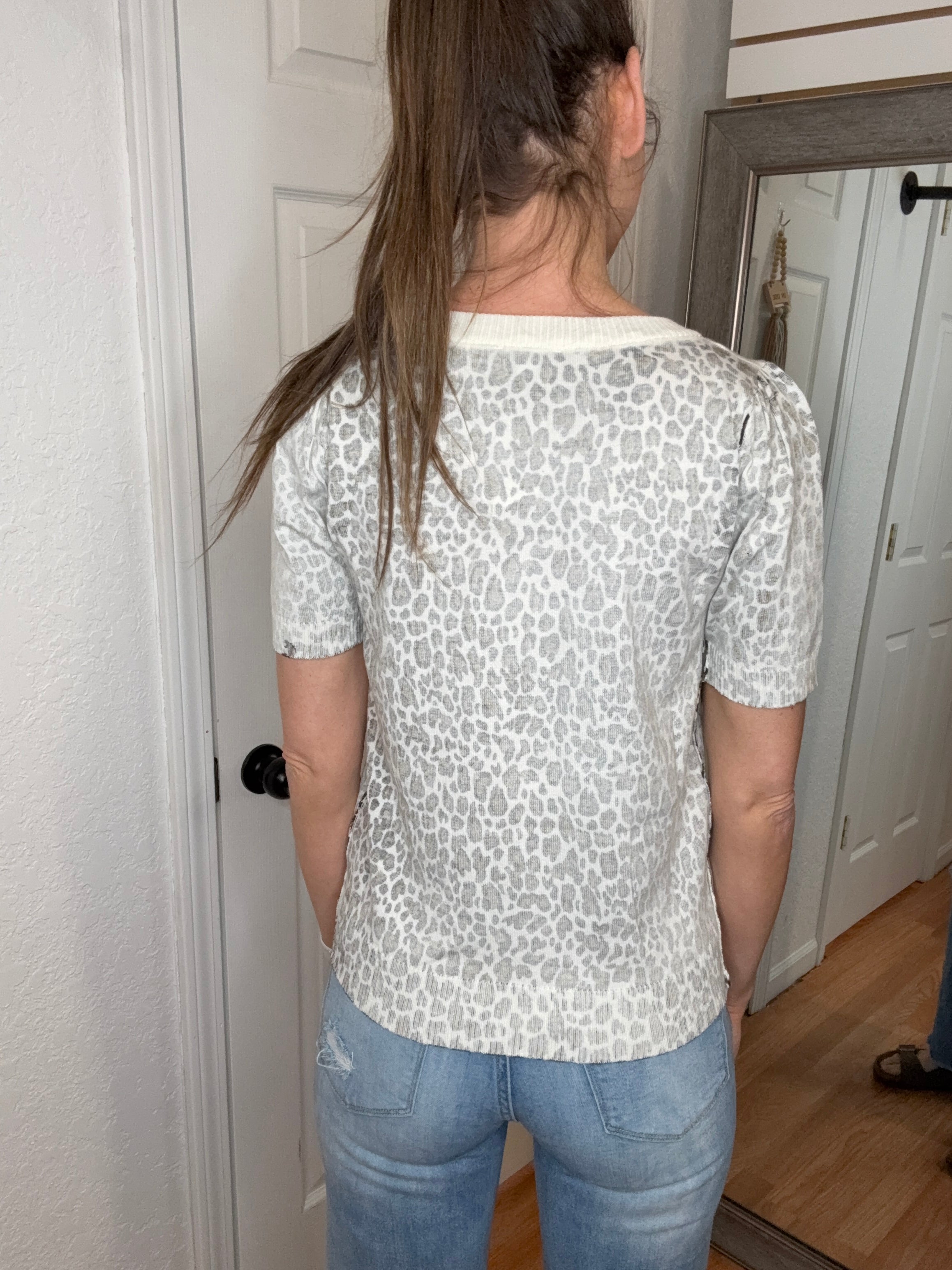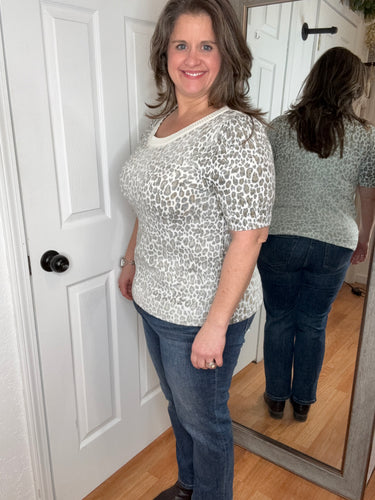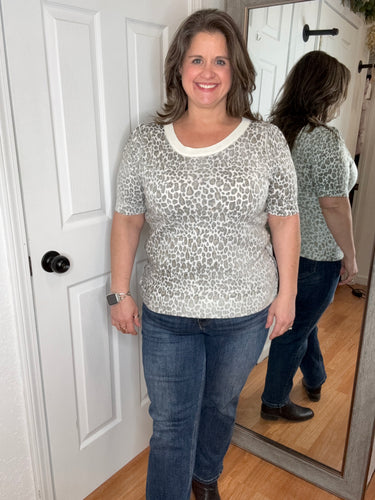 A short sleeve leopard print knit top with a round neck featuring an inside out body print and a true-to-size fit. Fabric is a lightweight knit.