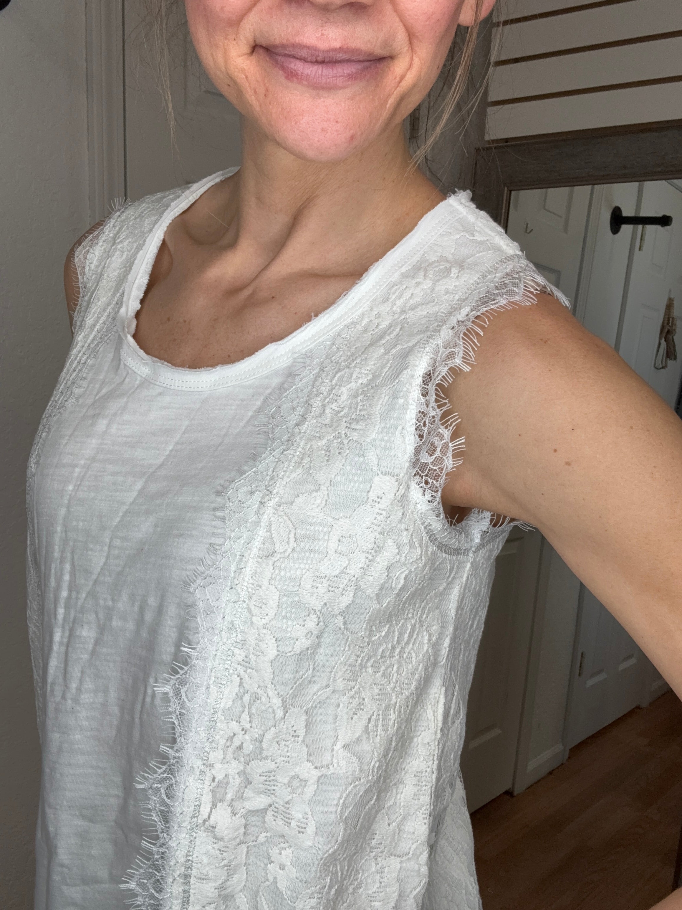 Features: Round neck sleeveless top, with layered lace detail.