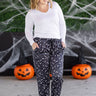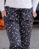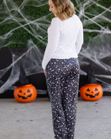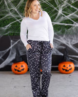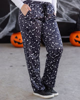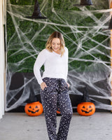 Embrace the spooky season with our lounge pants! Features a stretchy waistband and adjustable tie, these pants offer ultimate comfort while keeping your essentials close in the pockets. Perfect to wear for the Halloween season whether you are trick-or-treating or handing out candy-these are your go-to lounge pants for the season!
