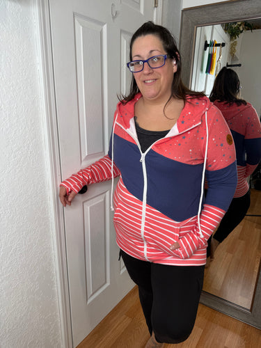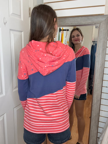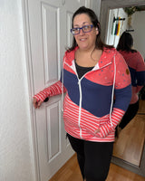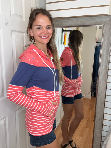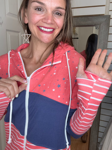 Be bold and make a statement with our Colorblock Full zip Hoodie! Featuring a trendy color block design with stars, navy, and stripes This hoodie is perfect for the holiday! Made with stretchy fabric for ultimate comfort, this hoodie will keep you looking stylish and feeling confident all season long.