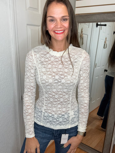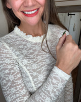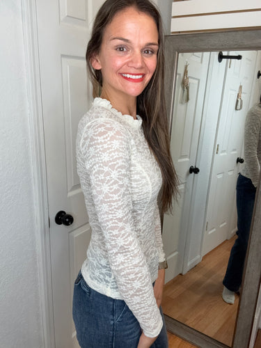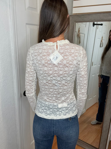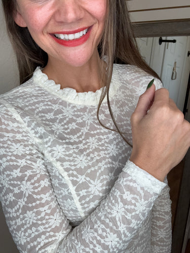 FEATURES: LONG SLEEVE LACE LAYERING TOP. RUFFLE NECK, WITH KEYHOLE BACK. AVERAGE TO SHORTER LENGTH.