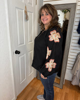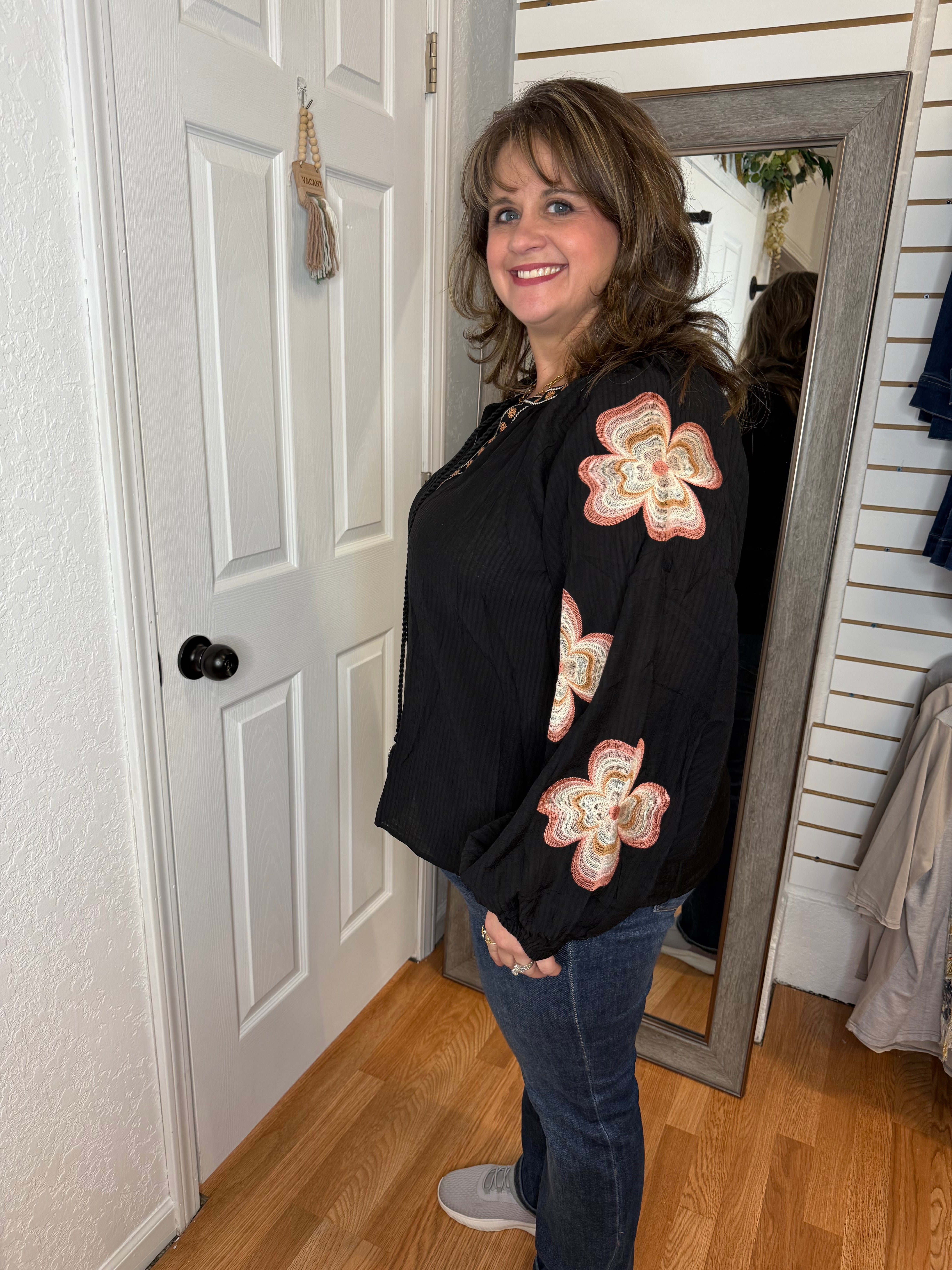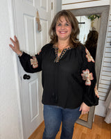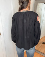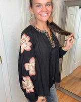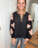 Embrace effortless elegance with the KYLIE Long Sleeve Blouse Top in classic black. This blousy fit offers comfortable movement while delicate embroidered flowers on the sleeves add a subtle, feminine touch. Perfect for dressing up or casual days, it blends style and ease to support your busy lifestyle with grace and charm.