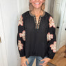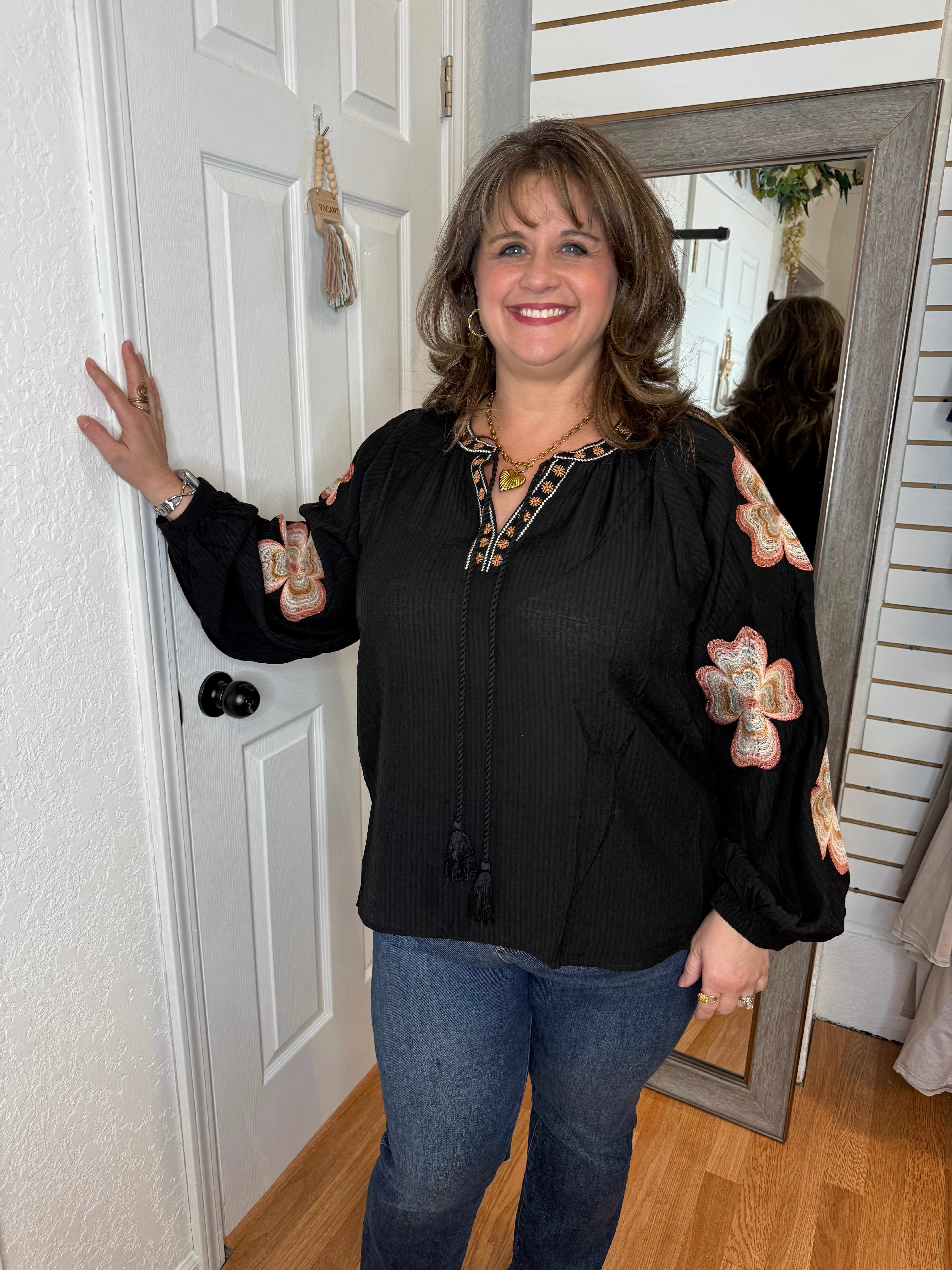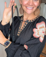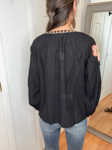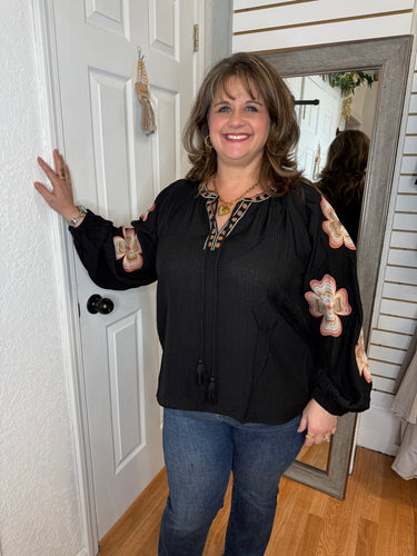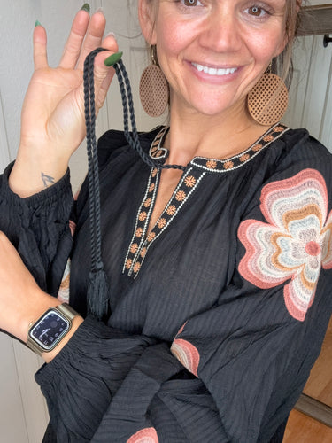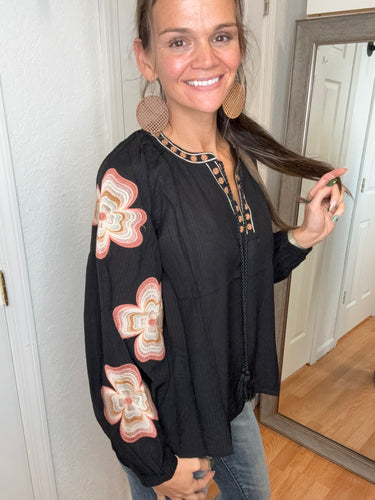 FEATURES: RAGLAN SEEAM, LONG SLEEVE WITH ELASTIC CUFF, FUNCTIONAL TIE FRONT NECKLINE WITH TASSLES, EMBROIDERY ON NECKLINE AND DOWN SLEEVES. BLACK BASE COLOR, NEUTRAL TANS, CREAMS, AND BLUSH TONED EMBROIDERY.