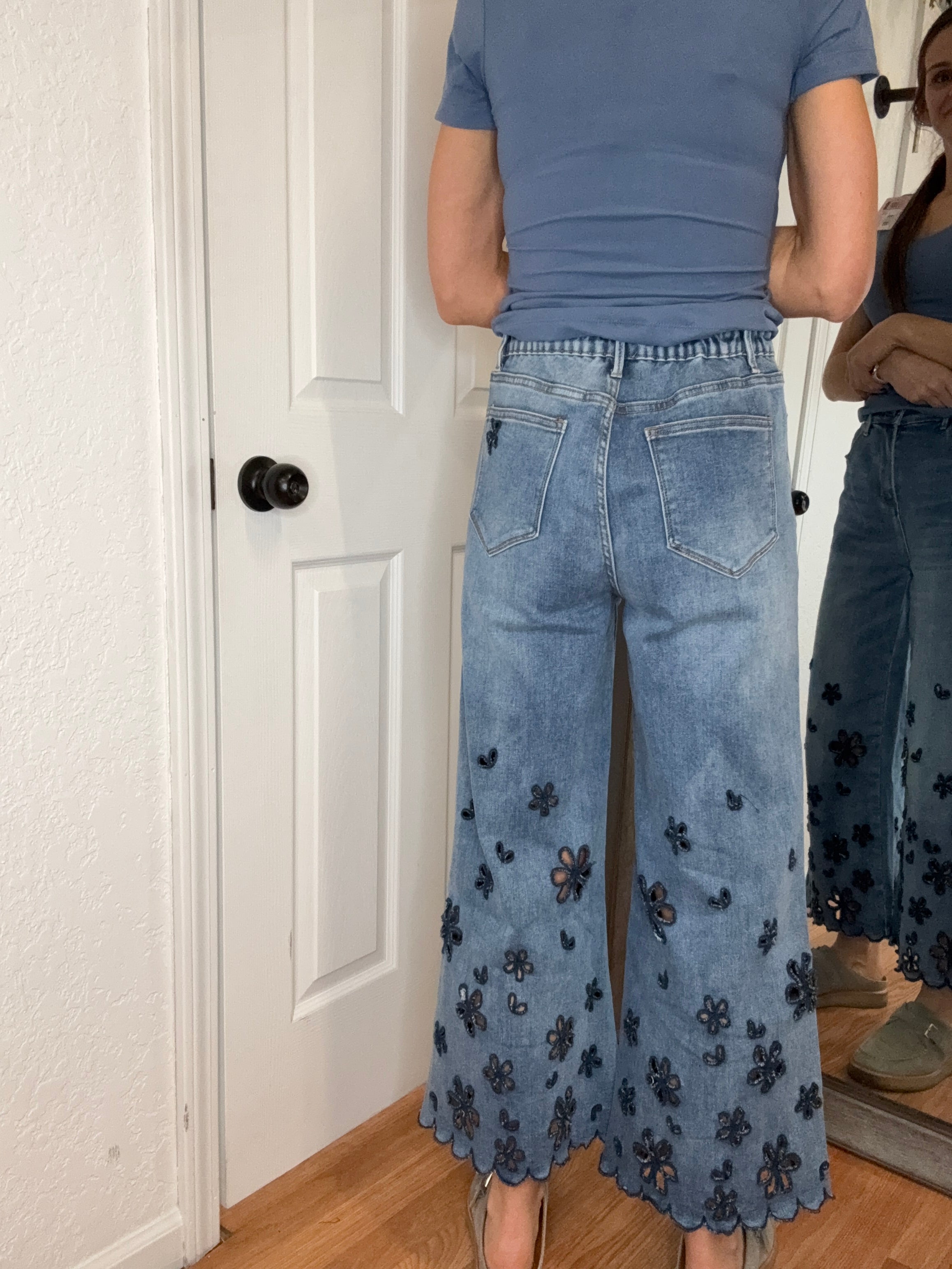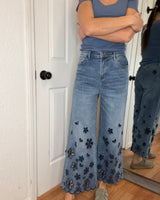 Features: Mineral wash, with embroidered flower cutouts. Elastic back waist, with a functional button and zip front. 5 Functional pockets.