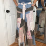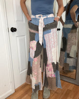 Features: Relaxed-fitting leg, with elastic back stretch waistband, functional button, attached tie belt and functional zipper. Beautiful patchwork detail, with raw edge detail.