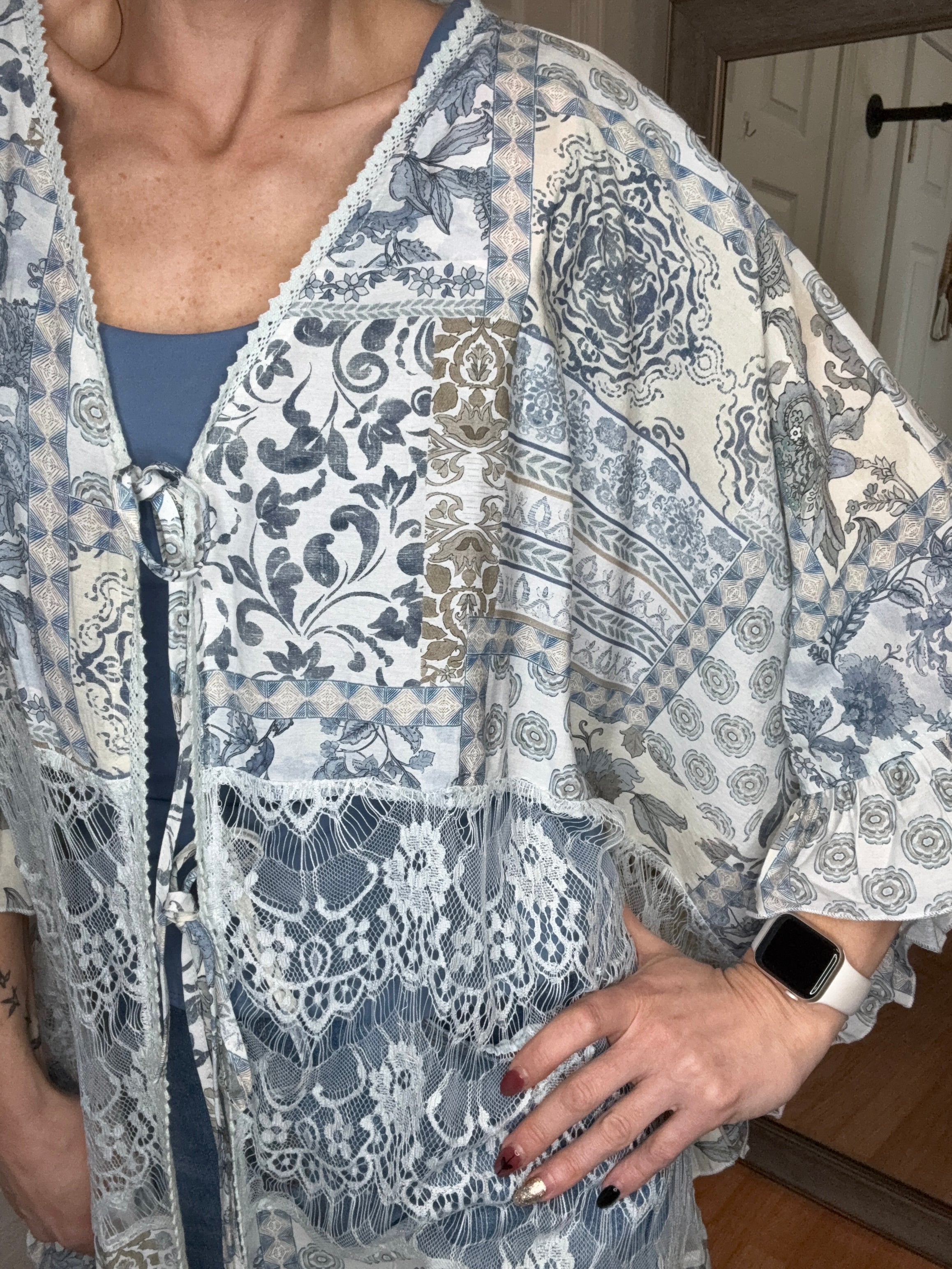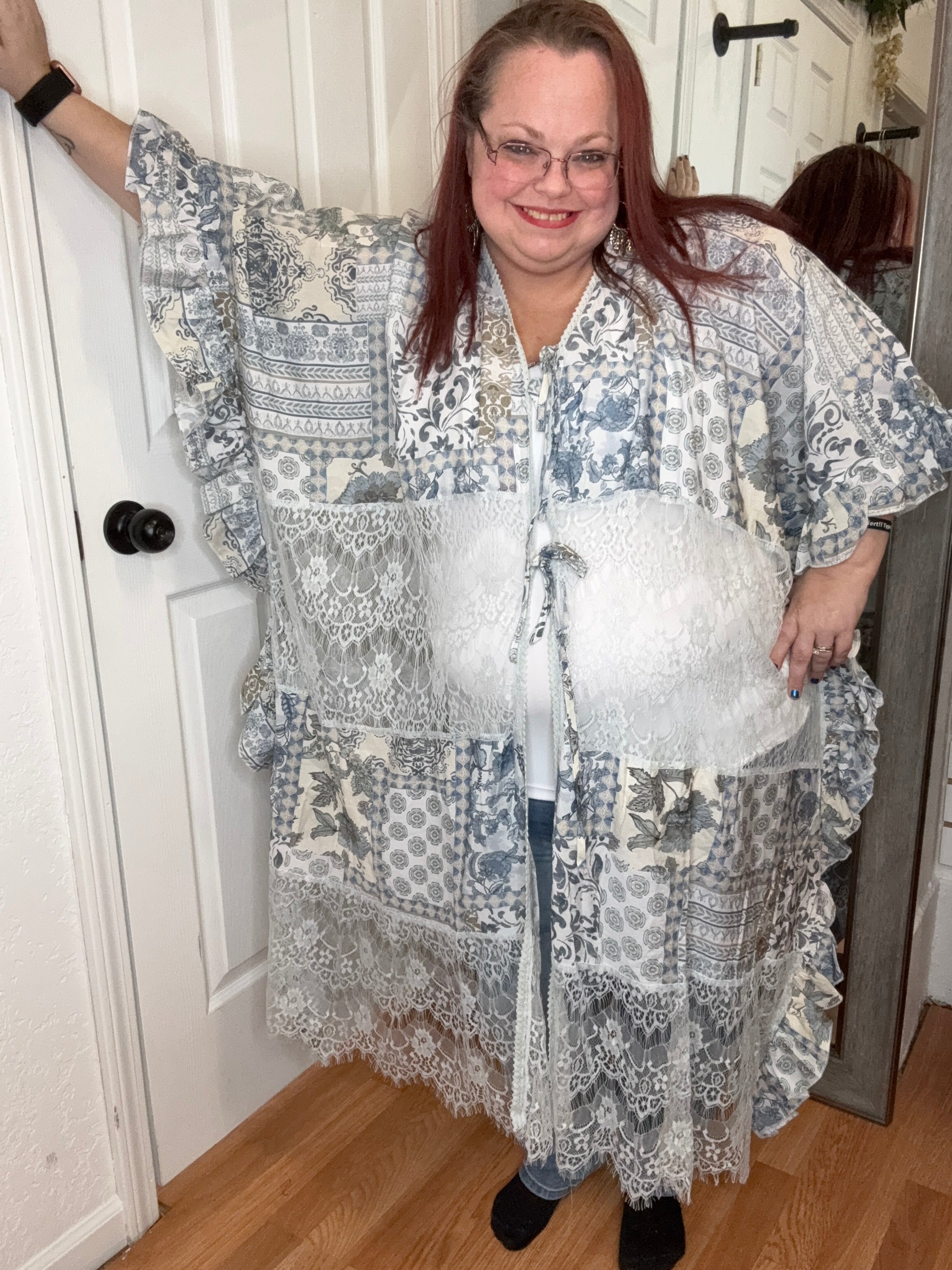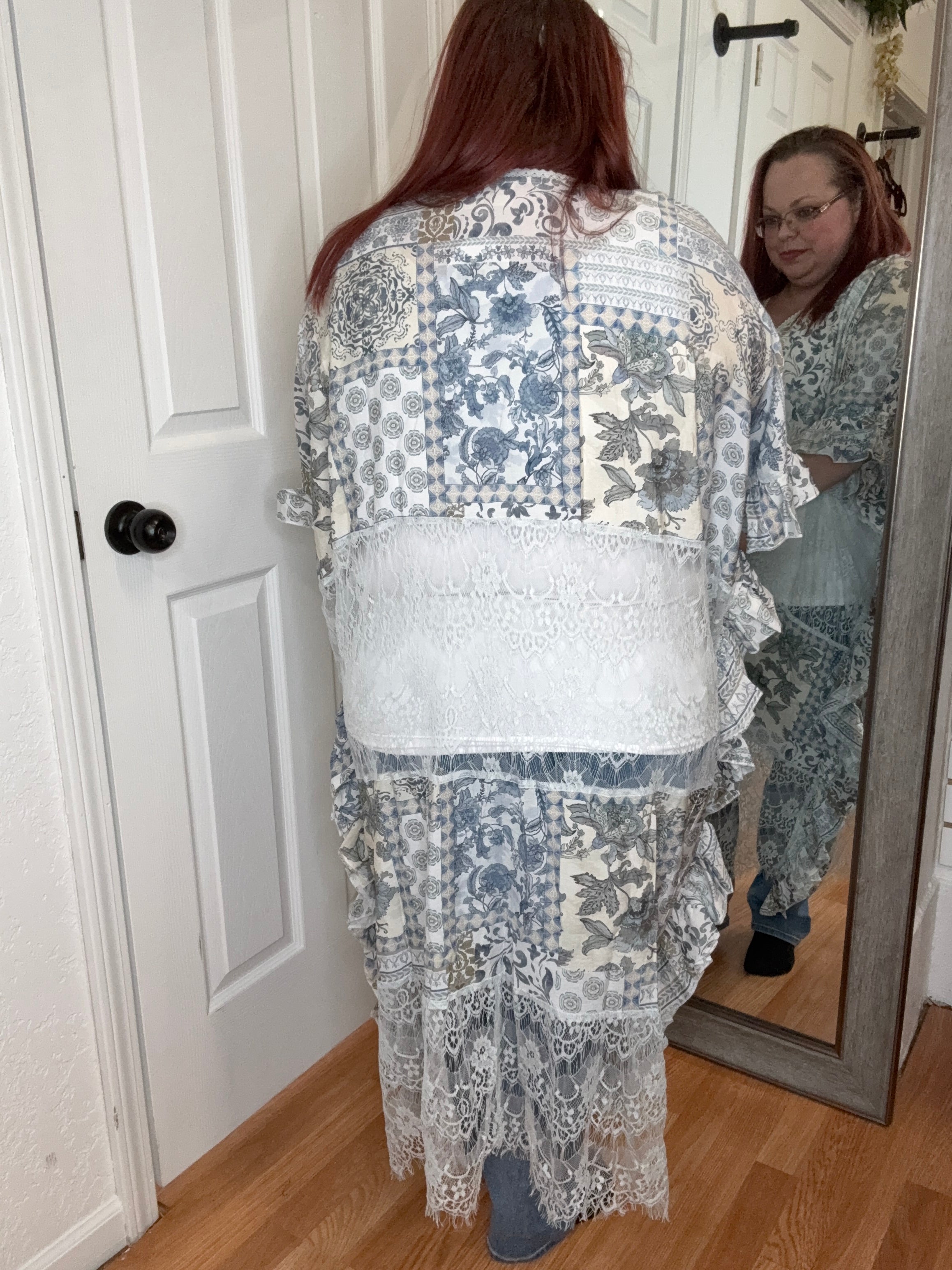 Features: Oversized, boho floral print with lace and ruffle details. Perfect to toss over a swimsuit, or wear with capris, shorts, or denim! 2 Functional ties in front,
