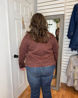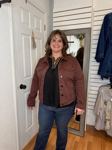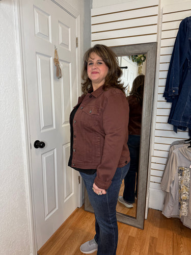 The Brinley Chocolate Risen Denim Jacket combines classic style with a rich chocolate hue for versatile layering. Crafted from durable denim, it offers both comfort and long-lasting wear. Perfect for cooler days or casual outings, this jacket adds a cozy touch to any outfit while elevating your everyday look with subtle sophistication.