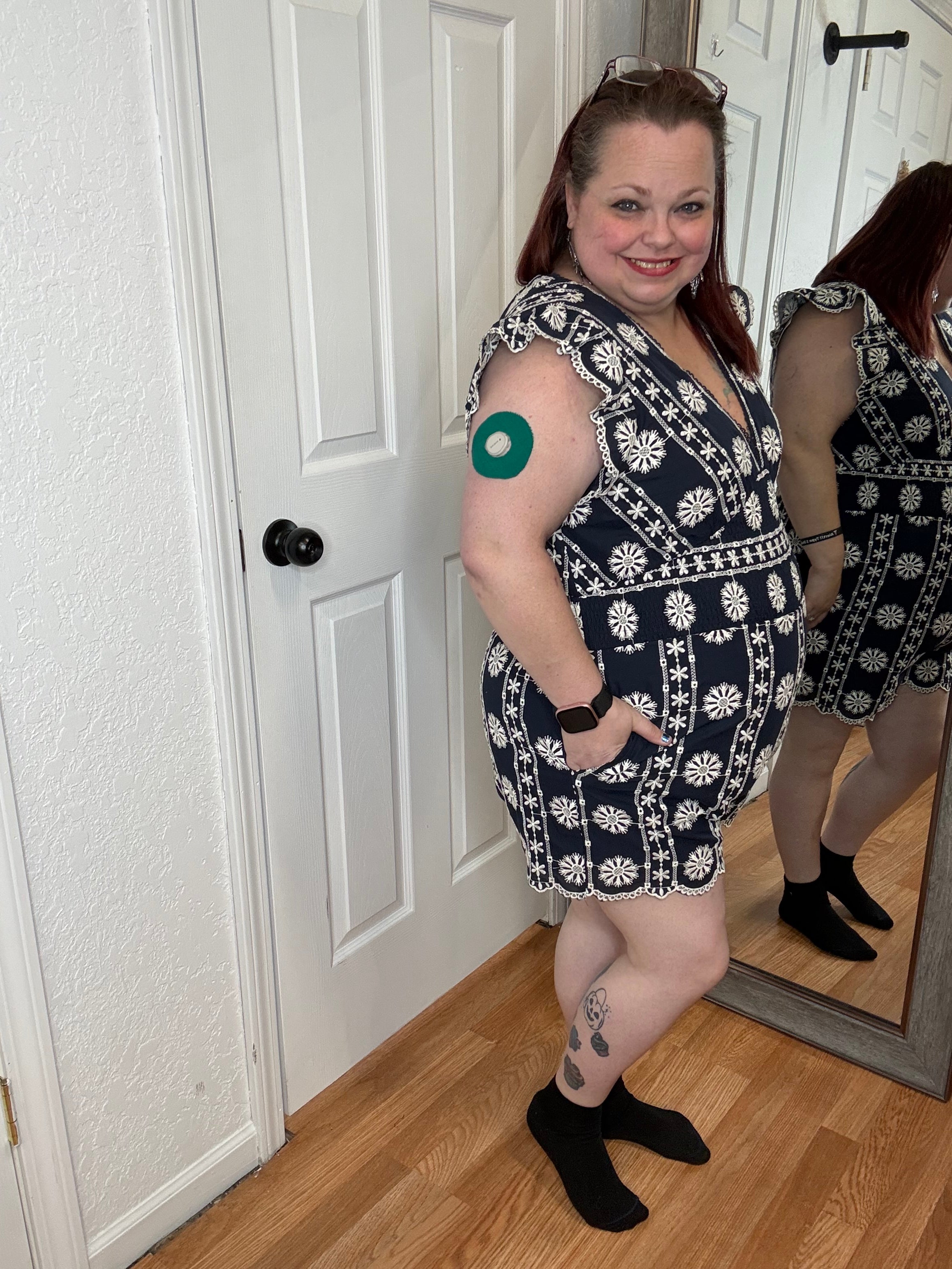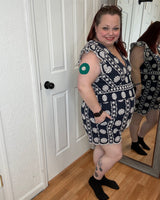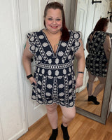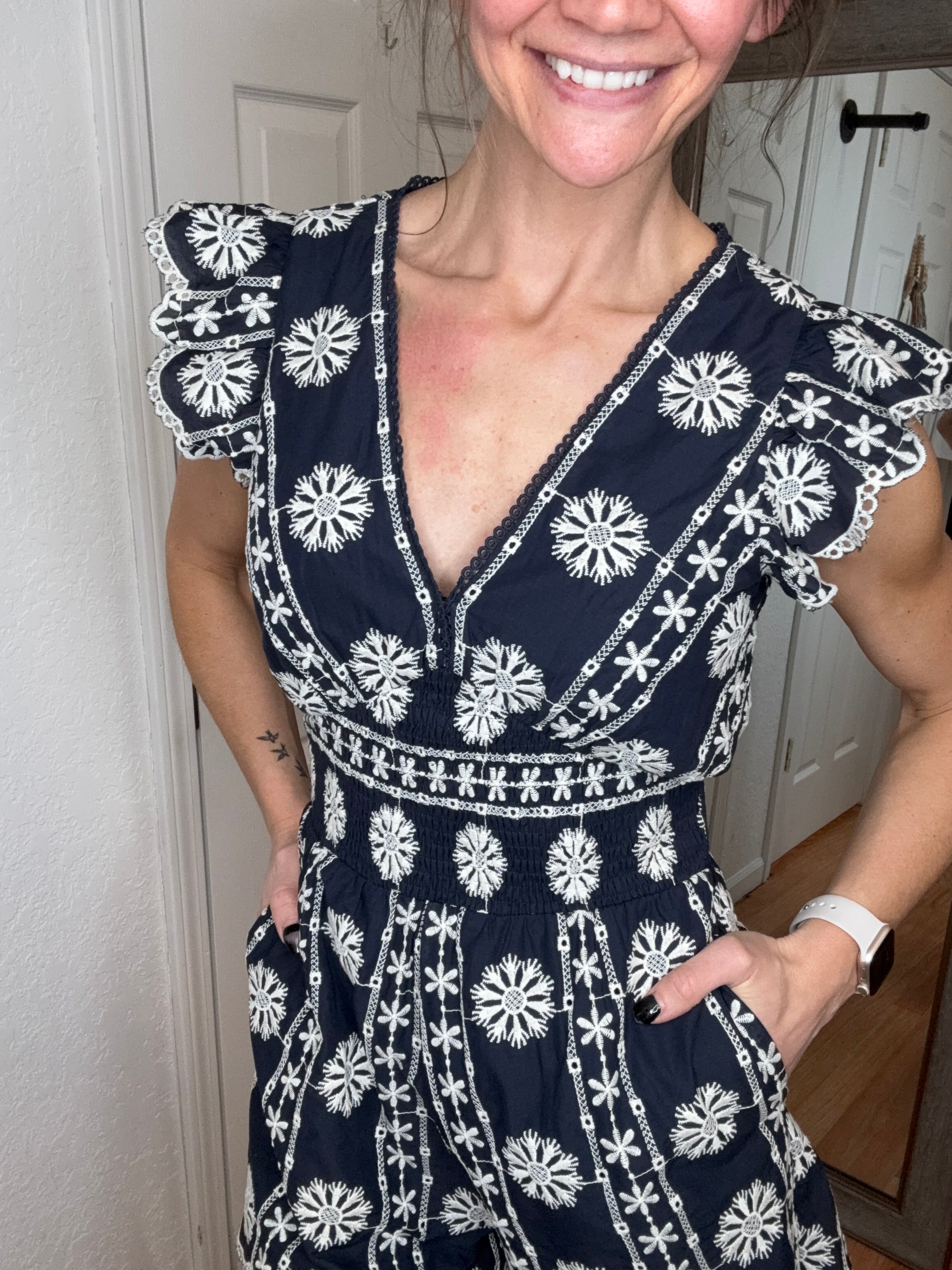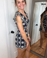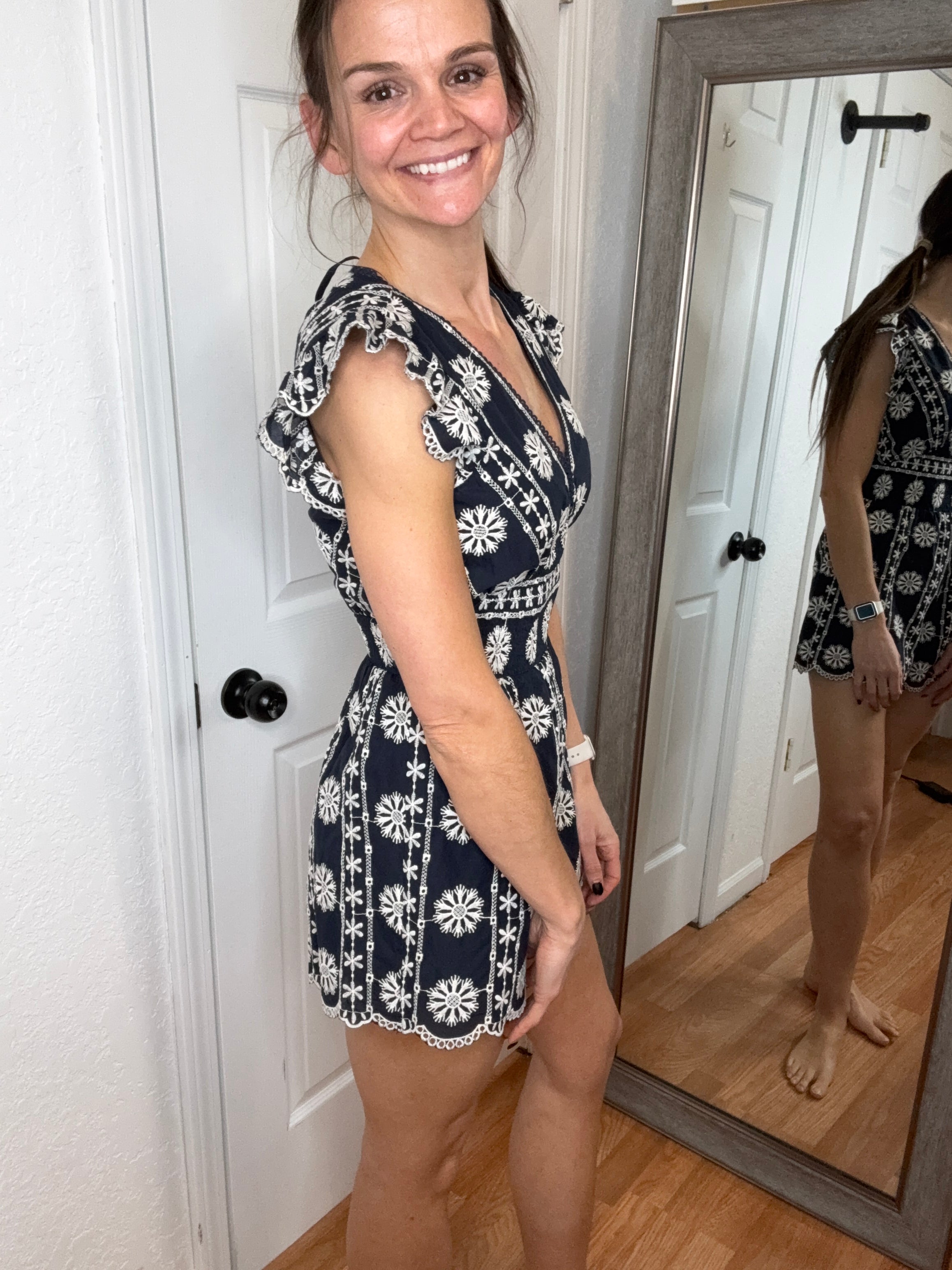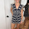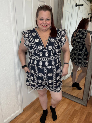 Features: One-piece pull-on V-neck romper (shorts), in dark navy blue with ivory embroidered details. Elastic smocked stretchy waist for shape. Tie back v-back for easy on/off.