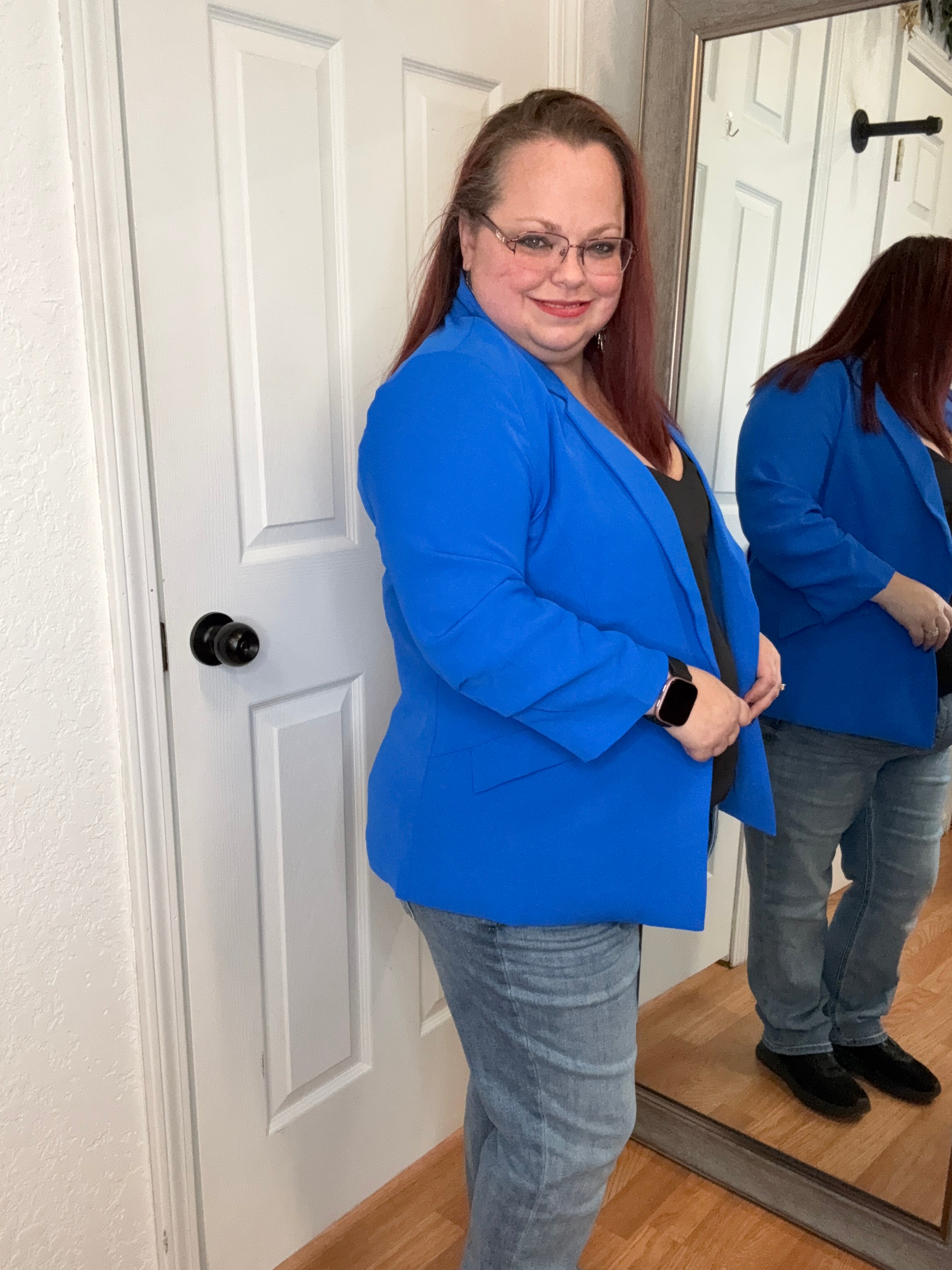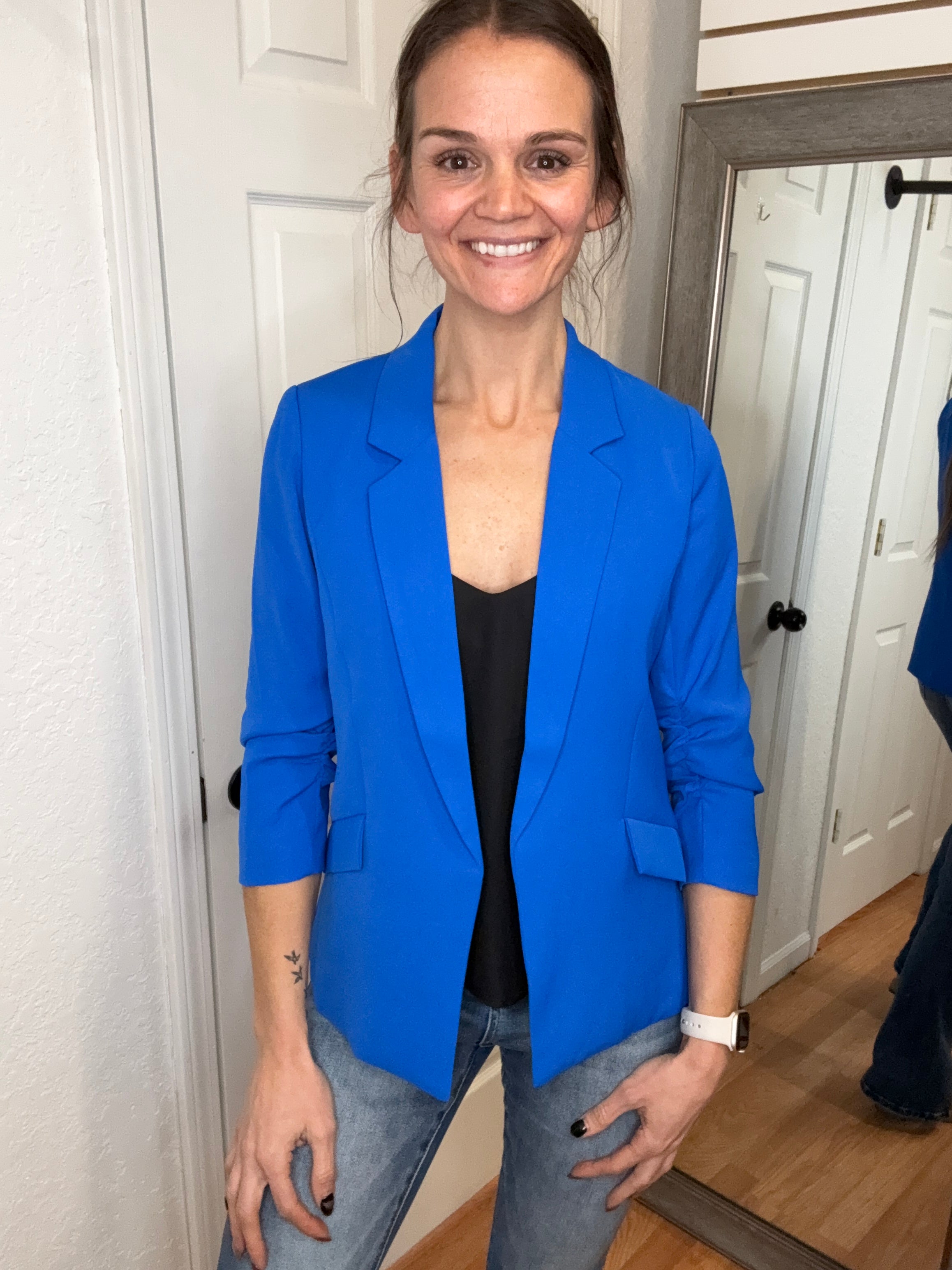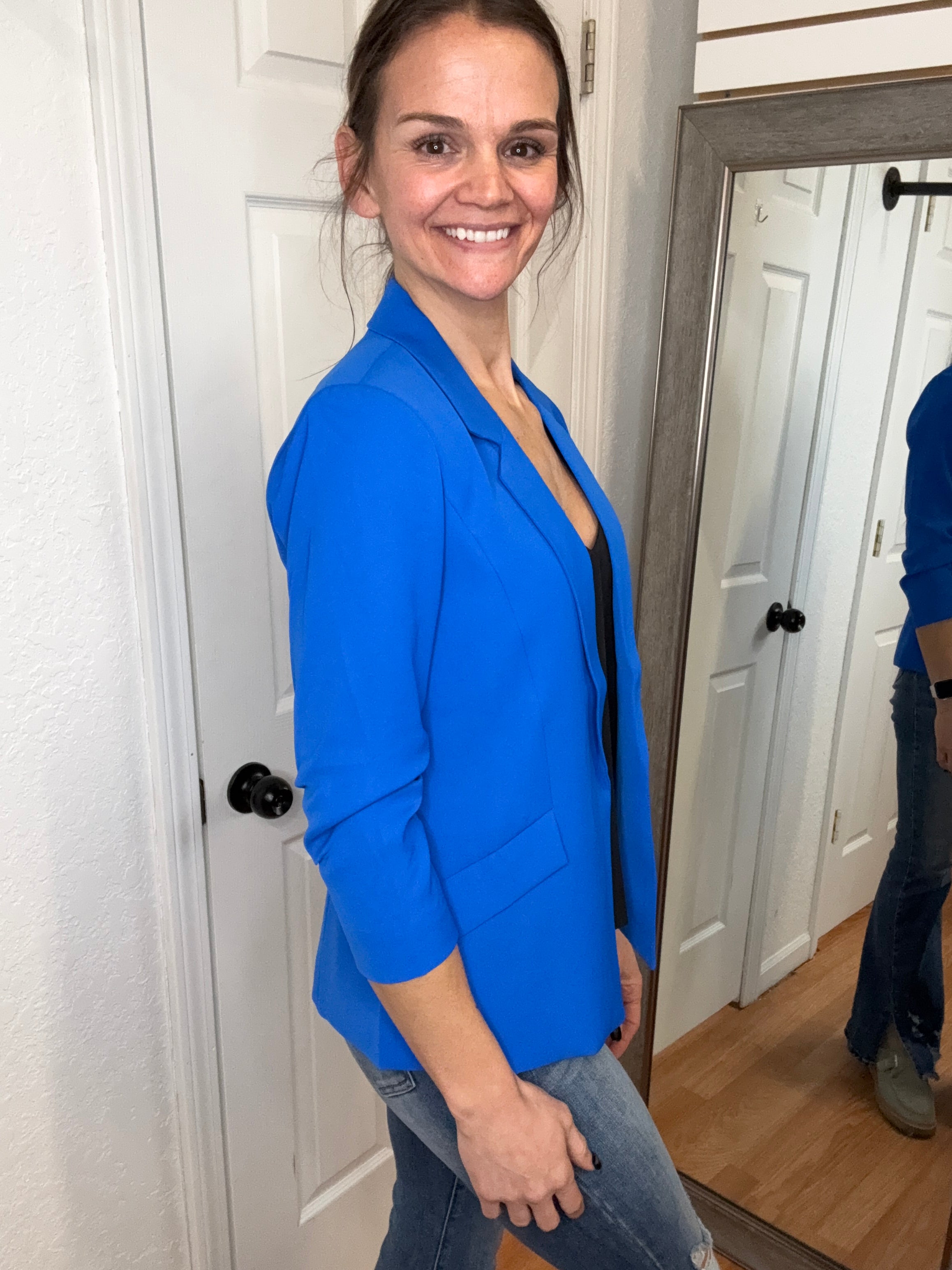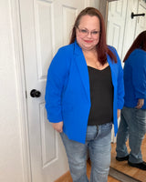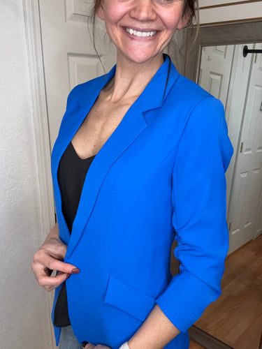 Elevate your everyday style with the Elexa Layering Blazer in Electric Blue. This versatile 3/4 sleeve piece is designed to work seamlessly over your favorite tops, adding instant polish and dimension to any outfit. The vibrant electric blue shade brings an energizing pop of color that transforms basics into something special. Perfect for layering through seasons, this blazer pairs effortlessly with jeans, dresses, or work wear. You've got the confidence to mix, match, and make it your own with this wardrobe essential.