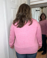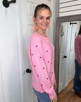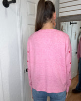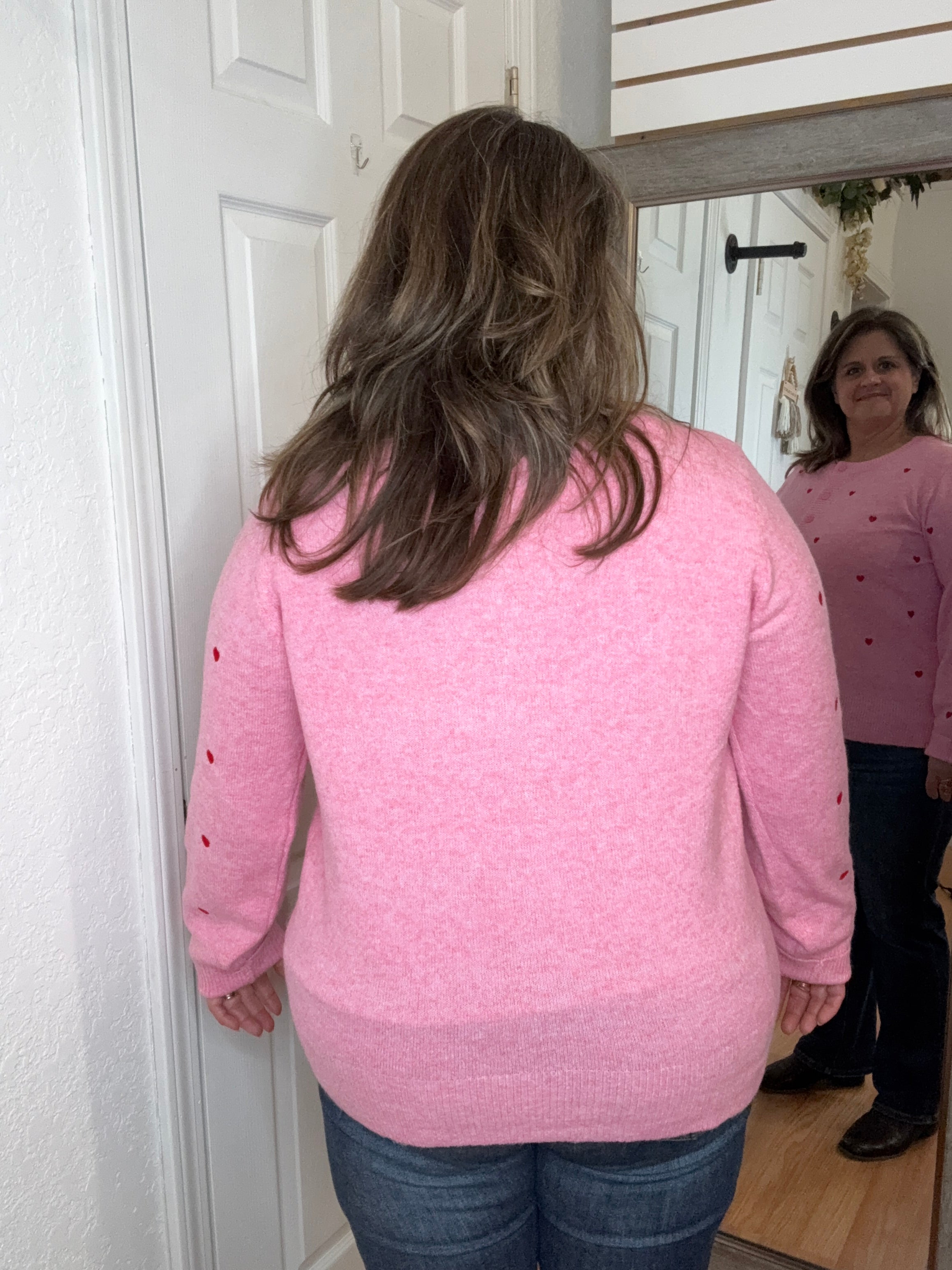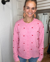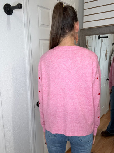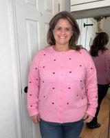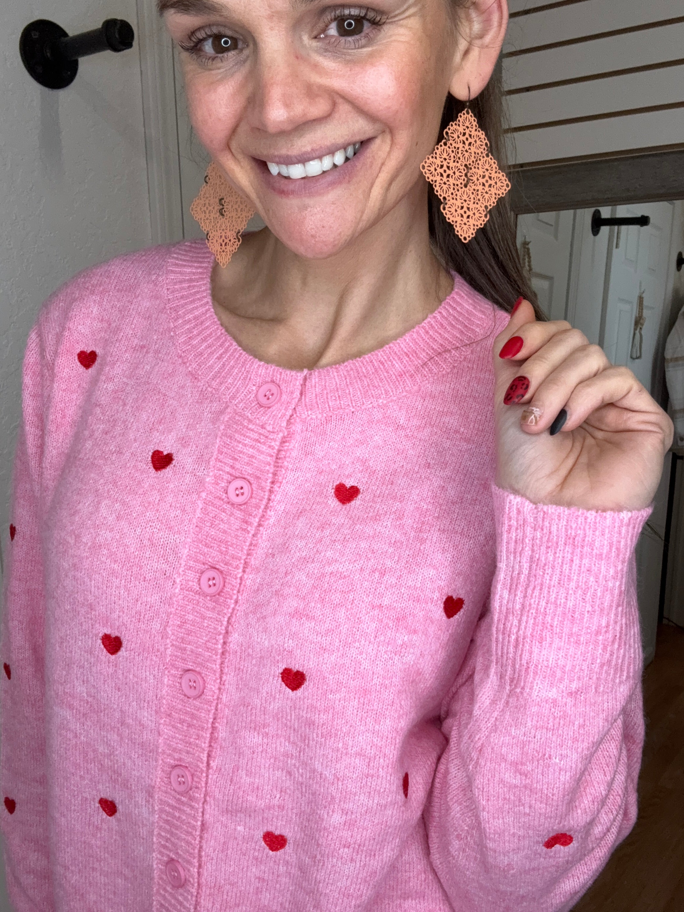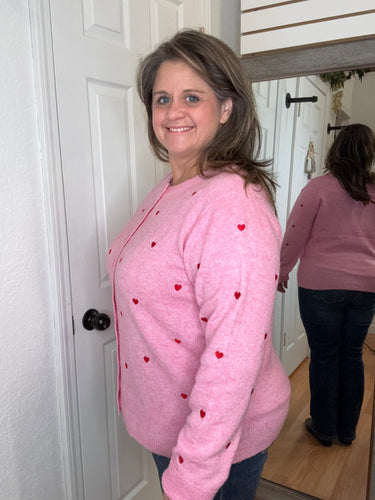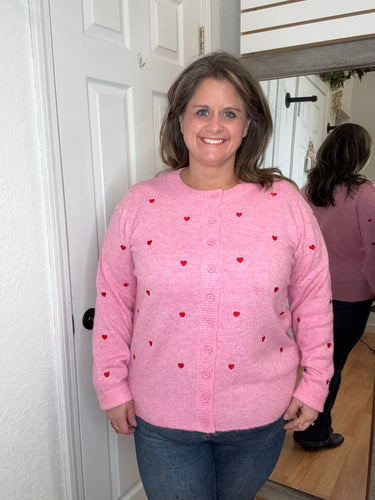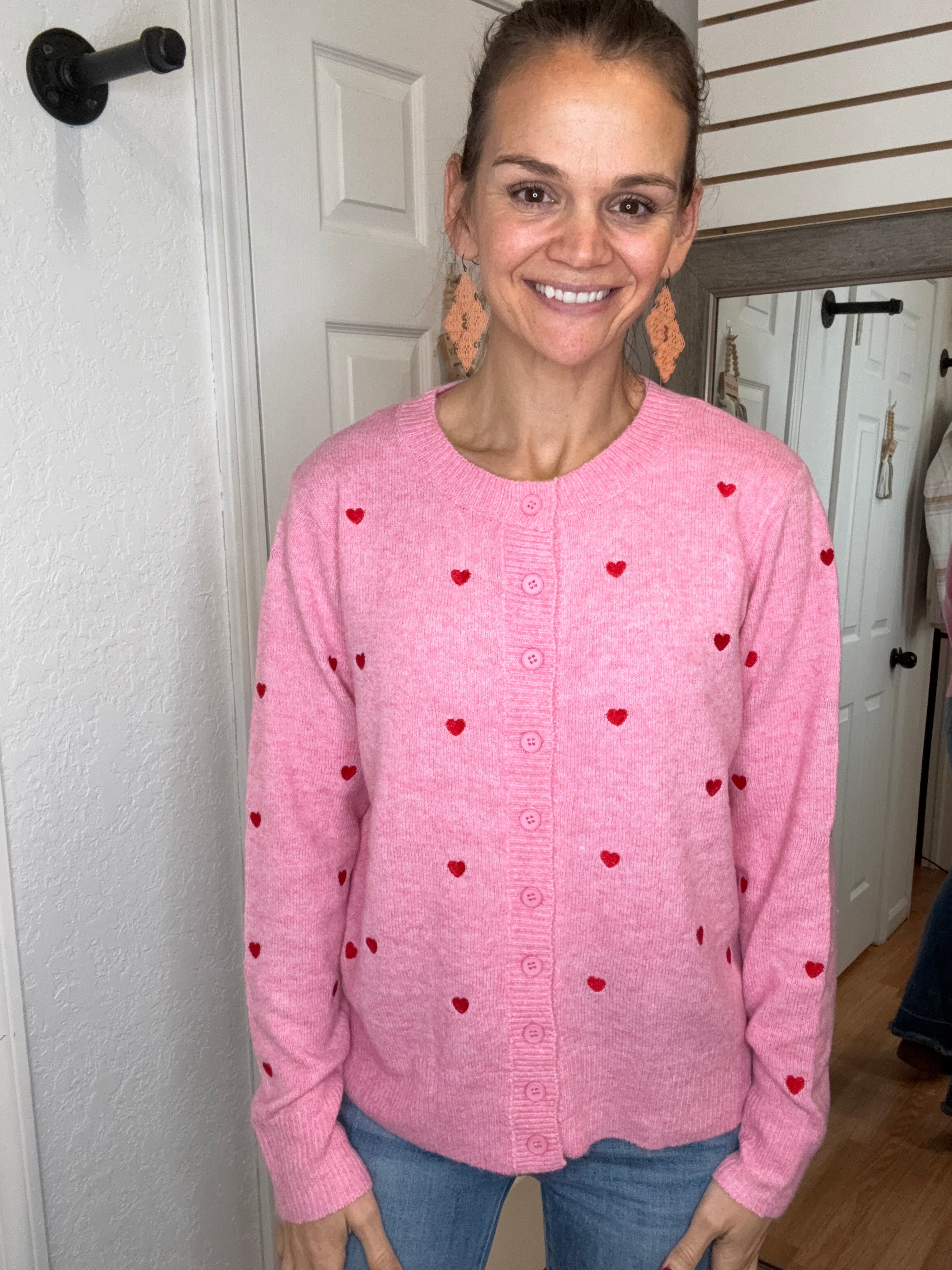 Features: Functional button down cardigan, with ribbed trim and crew neck. Pink with red hearts.