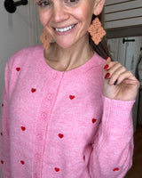 Spread love this season with our BE MINE Button Down Cardigan, featuring a charming pink knit adorned with bold red hearts. Perfect for layering over your favorite tees or dresses, this cozy piece adds warmth and personality to any outfit. The classic button-down design offers easy styling versatility, while the playful heart pattern brings a touch of romance to your everyday wardrobe. Ideal for casual wear or as a thoughtful gift for someone special.