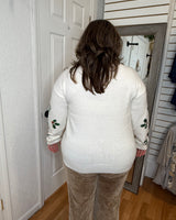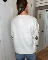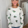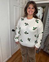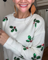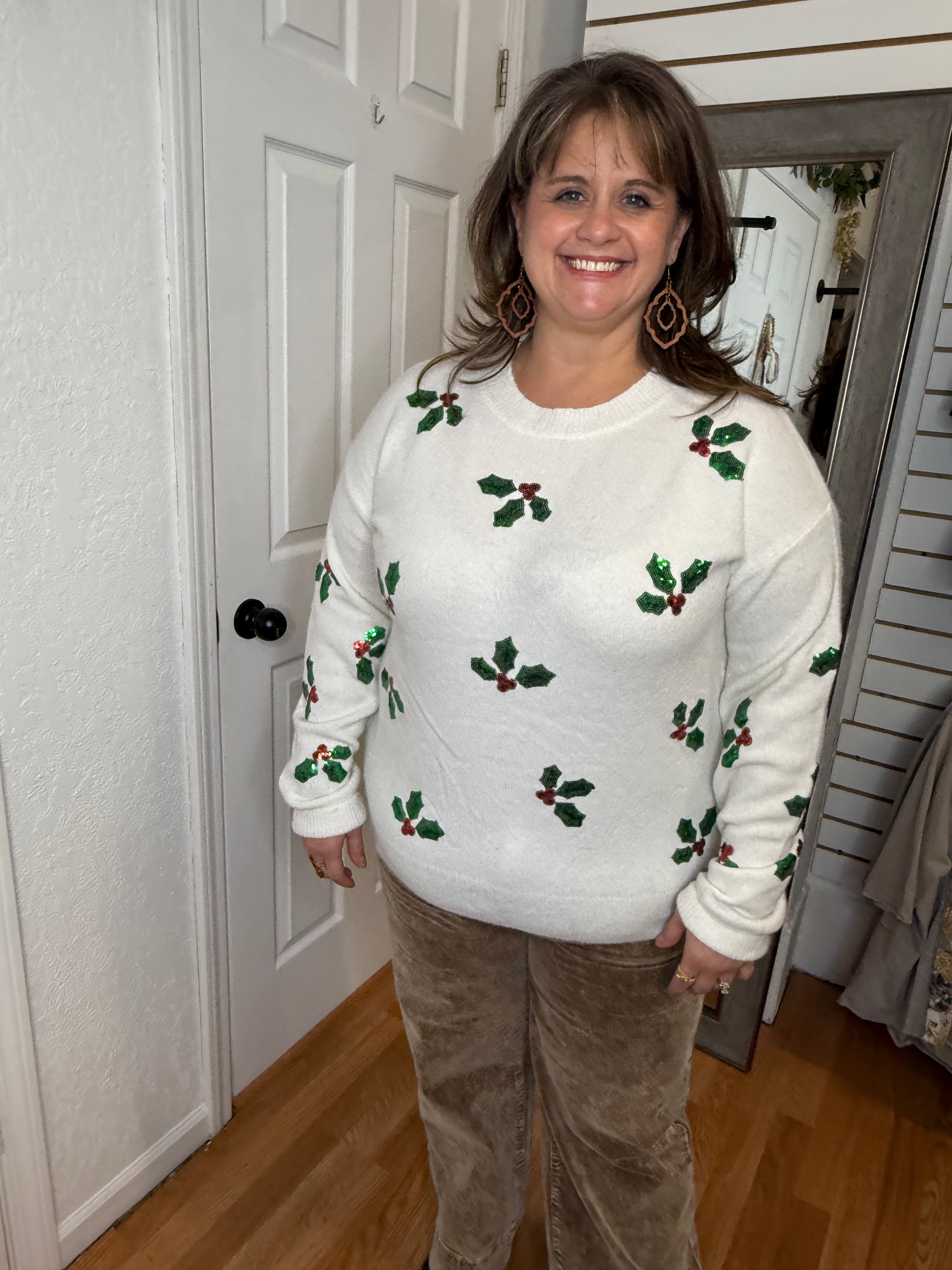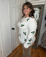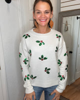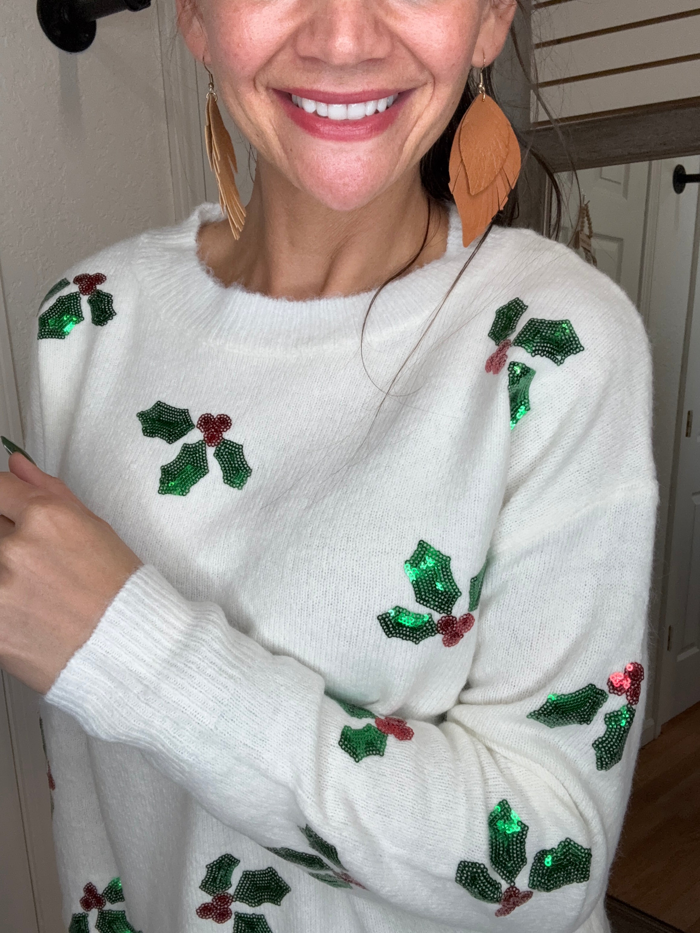 FEATURES: LONG SLEEVE CREW NECK SWEATER. RIBBED CUFFED TRIM AND WRIST, SEQUIN HOLLY LEAF DETAILS