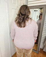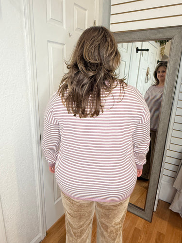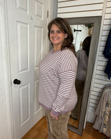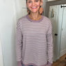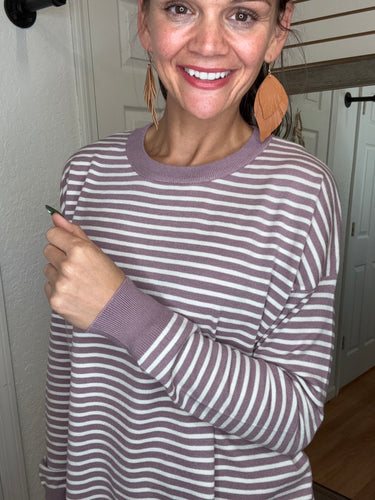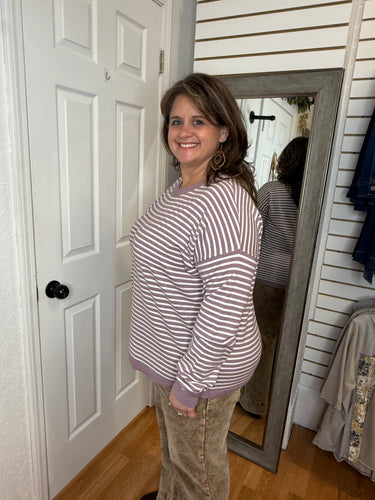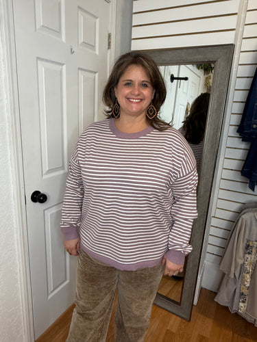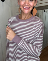 FEATURES: LONG SLEEVE, CREW NECK. LAVANDER AND OFF WHITE STRIPE. RIBBED CUFFS, AND TRIM .