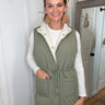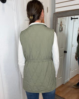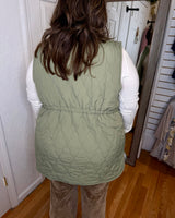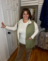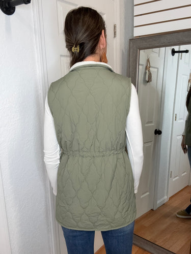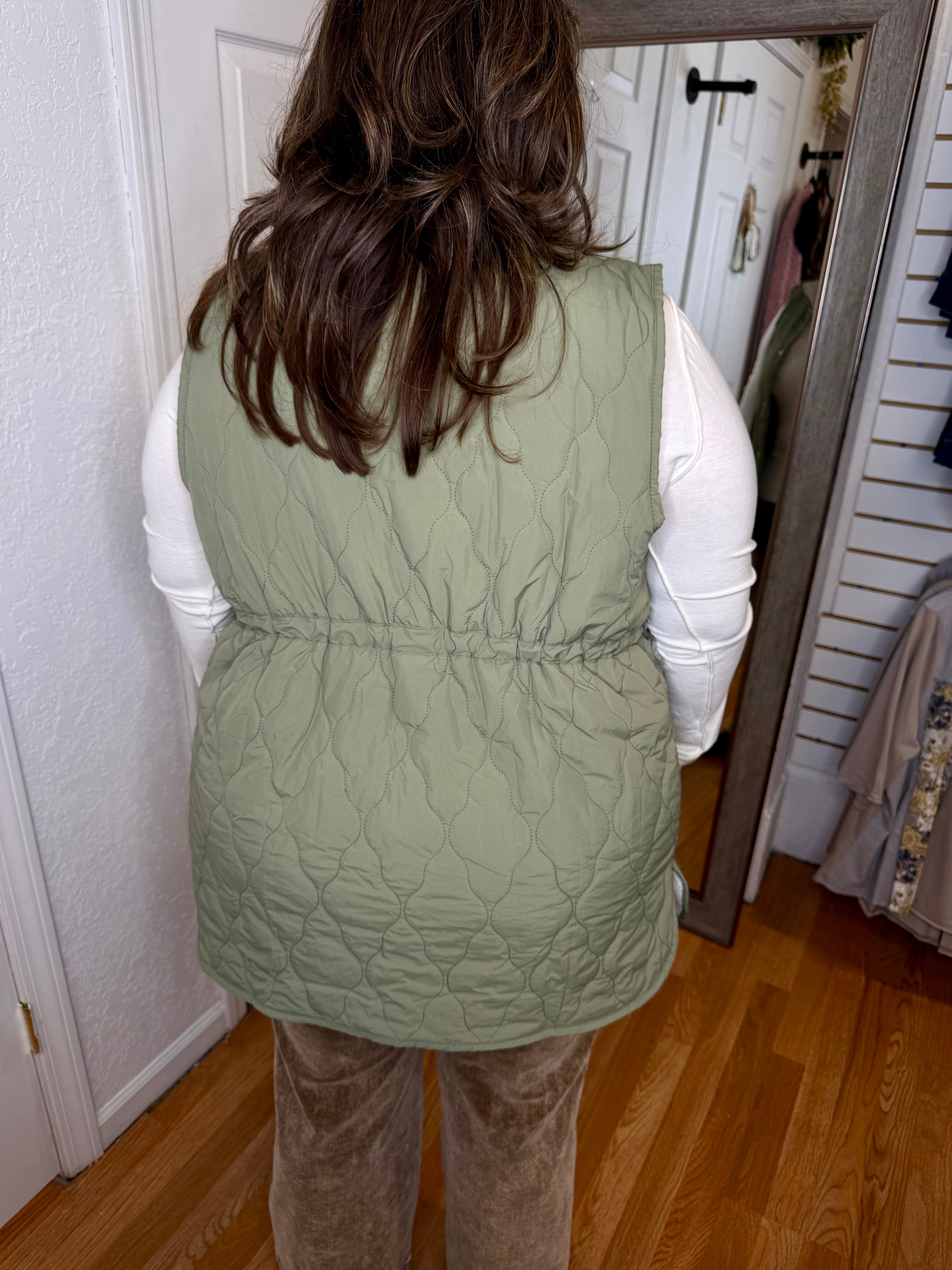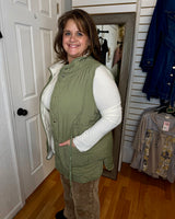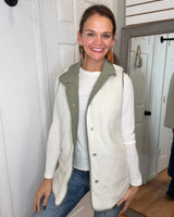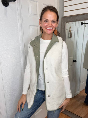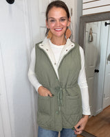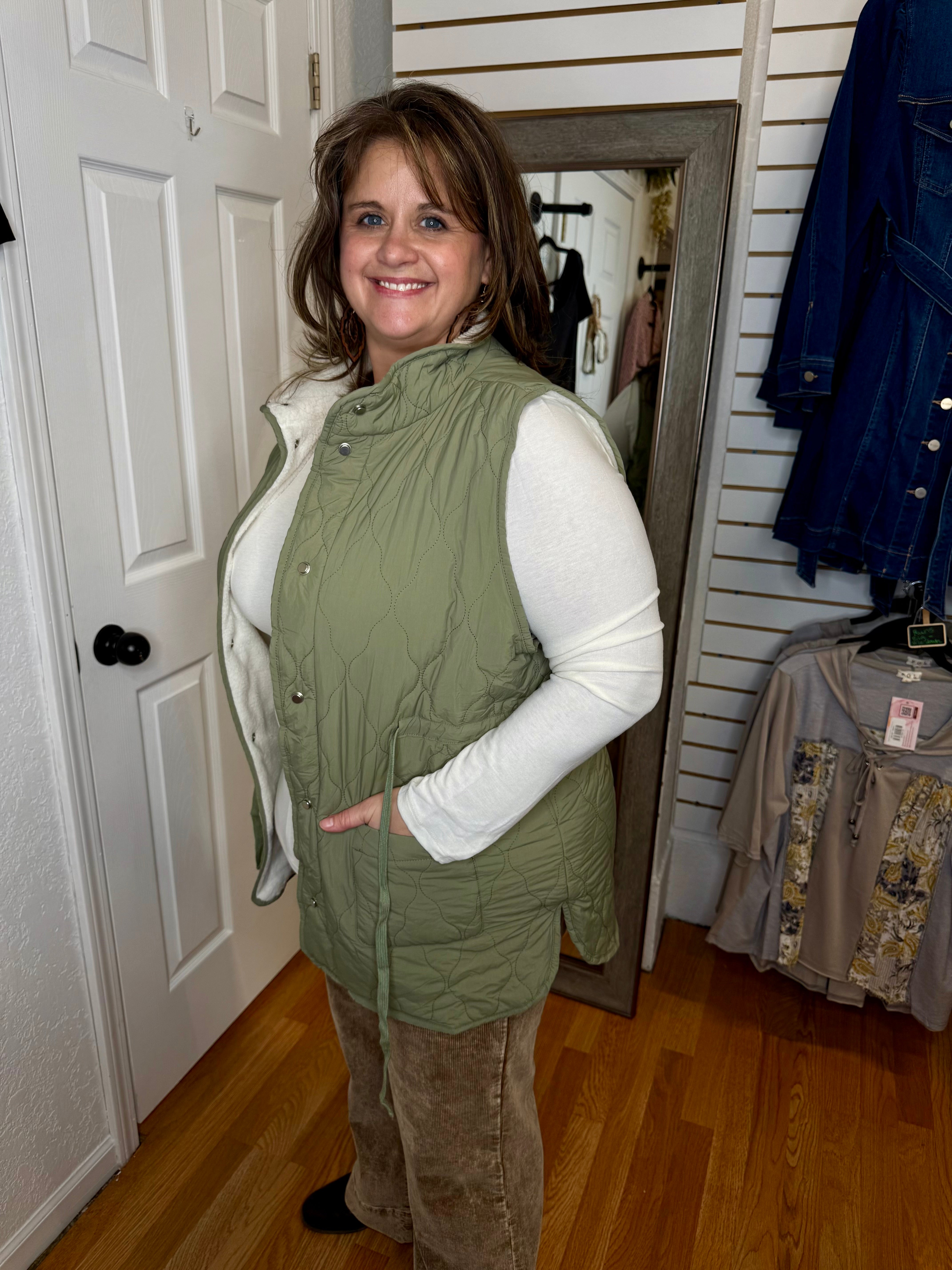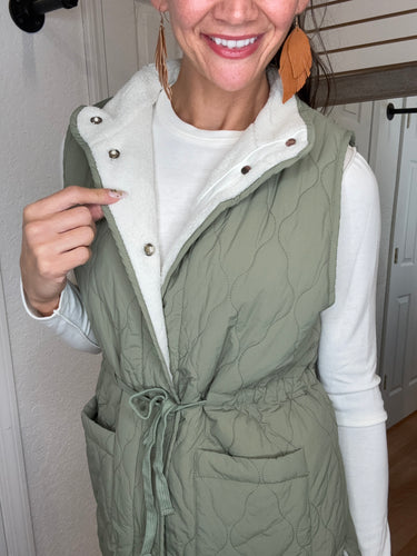 FEATURES: REVERSIBLE QUILTED VEST. OLIVE GREEN QUILTED OUTER LAYER, FLIPS TO IVORY SHERPA, FOR TWO FUN LOOKS! SNAP BUTTON DOWN, WITH DRAWSTRING WAIST FOR DESIRED SHAPE. FRONT PATCH POCKETS, SIDE SLITS, ROUNDED HEMLINE.