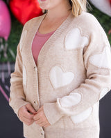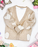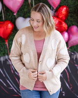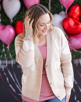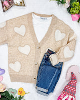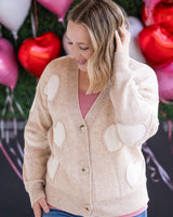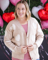 Get cozy and cute with our Sweetheart Cardigan in Tan! This button-down sweater cardigan features darling hearts and is soft to the touch. Perfect for Valentine's Day or any day you want to spread some love.