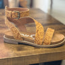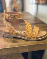 Experience comfort and style with the SYLVIE TOOLED STRAP SANDAL BY VERY G. The floral FLAT HEALED SANDAL, embossed ankle strap in camel and tan adds a touch of elegance to any outfit. Say goodbye to discomfort and hello to sophistication.