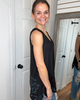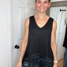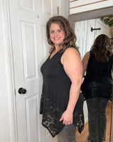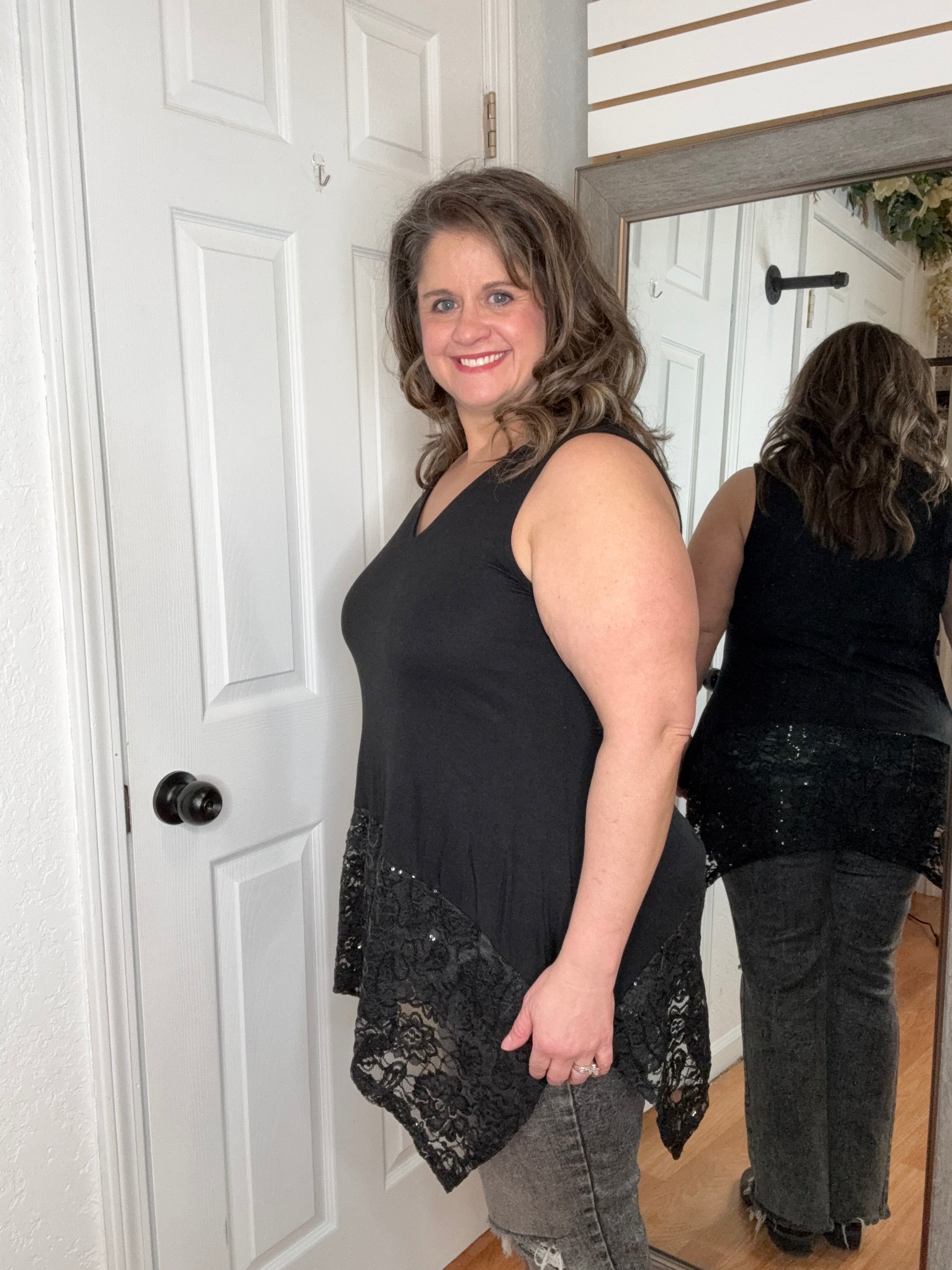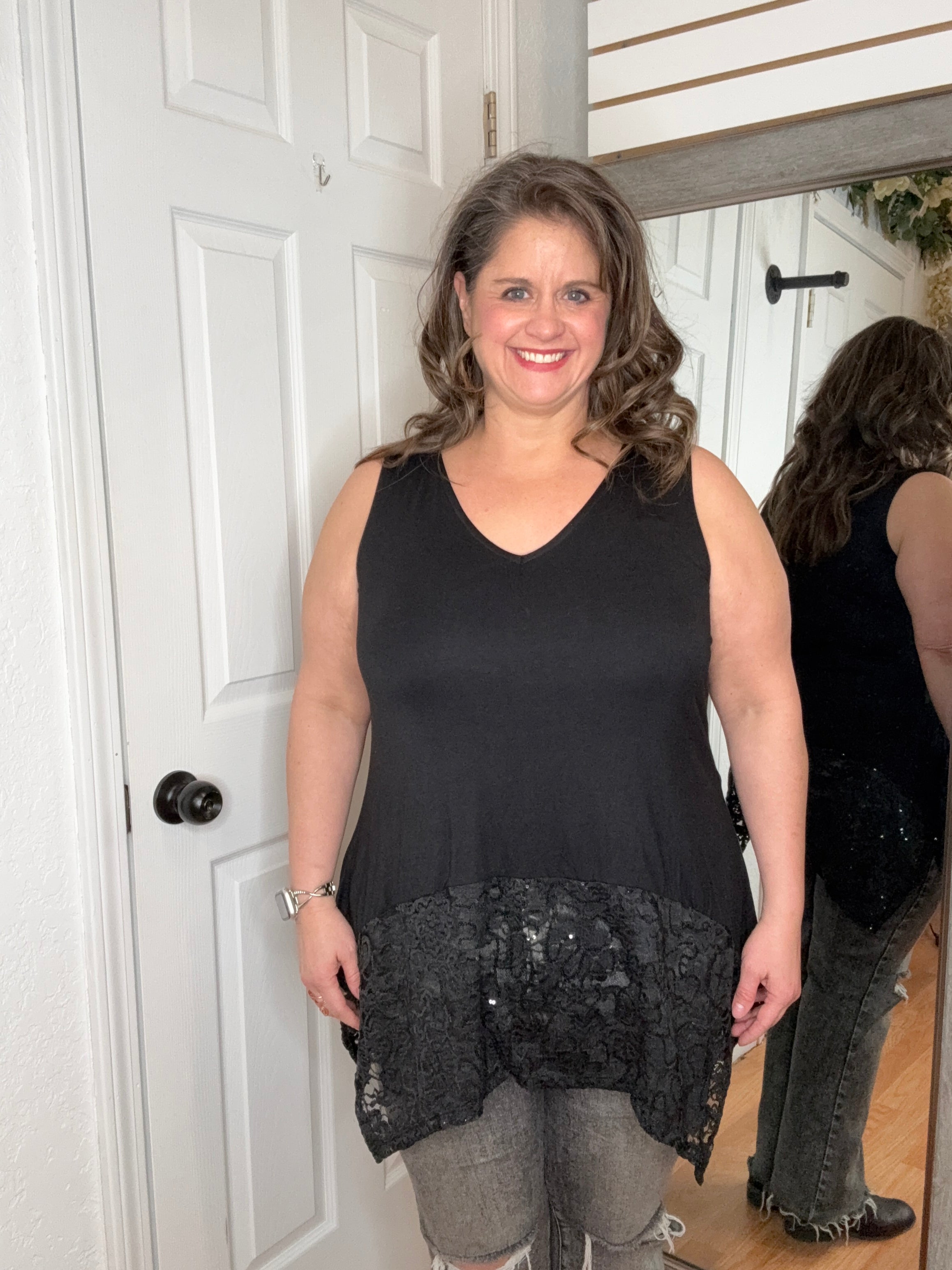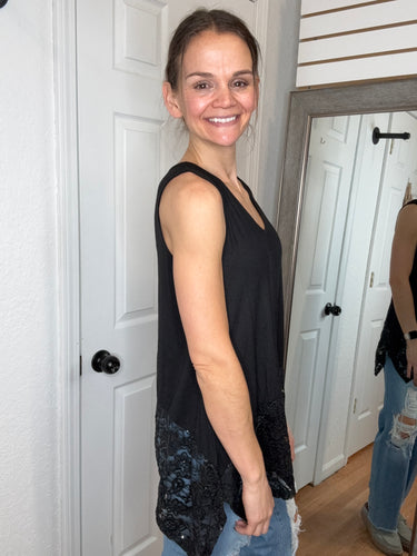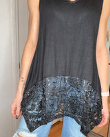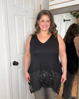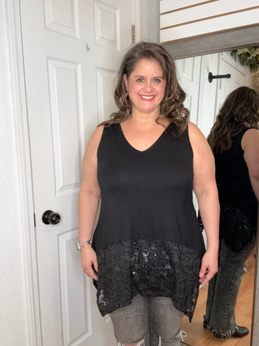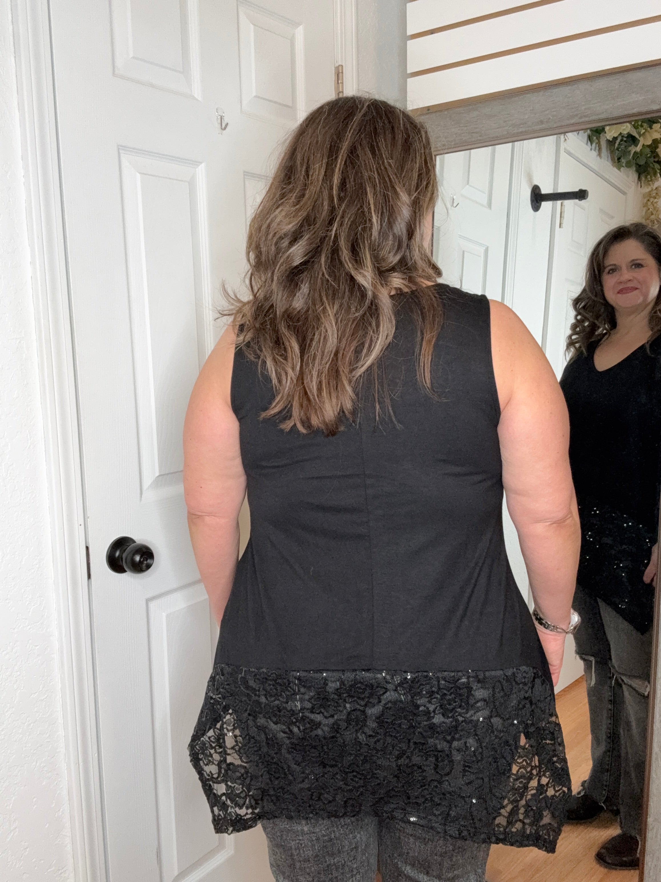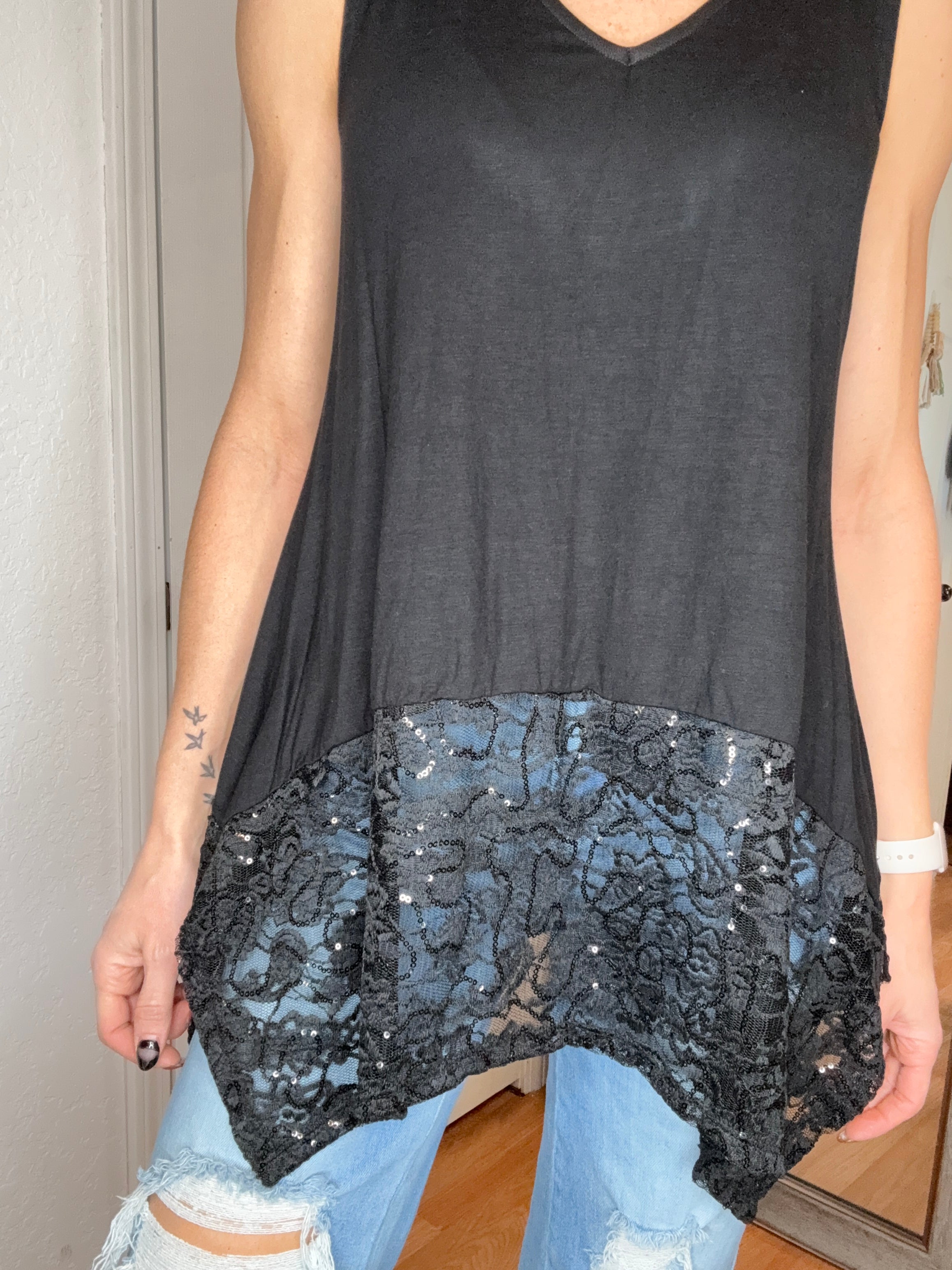 Features: v-neck sleeveless top, with asymmetrical hemline. Hemline has lace and sequin detail.