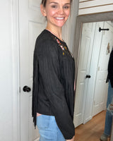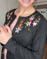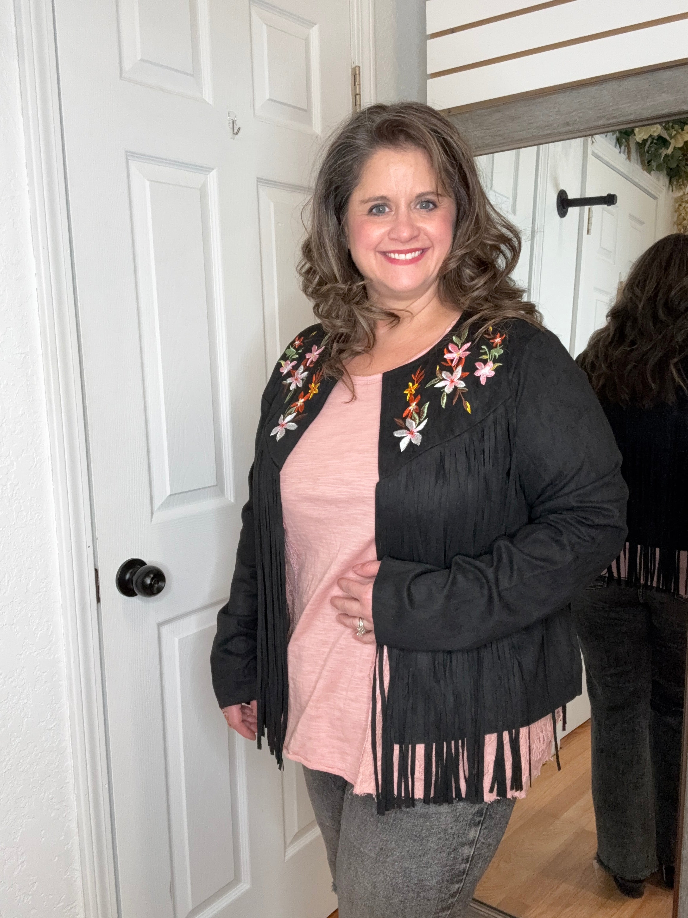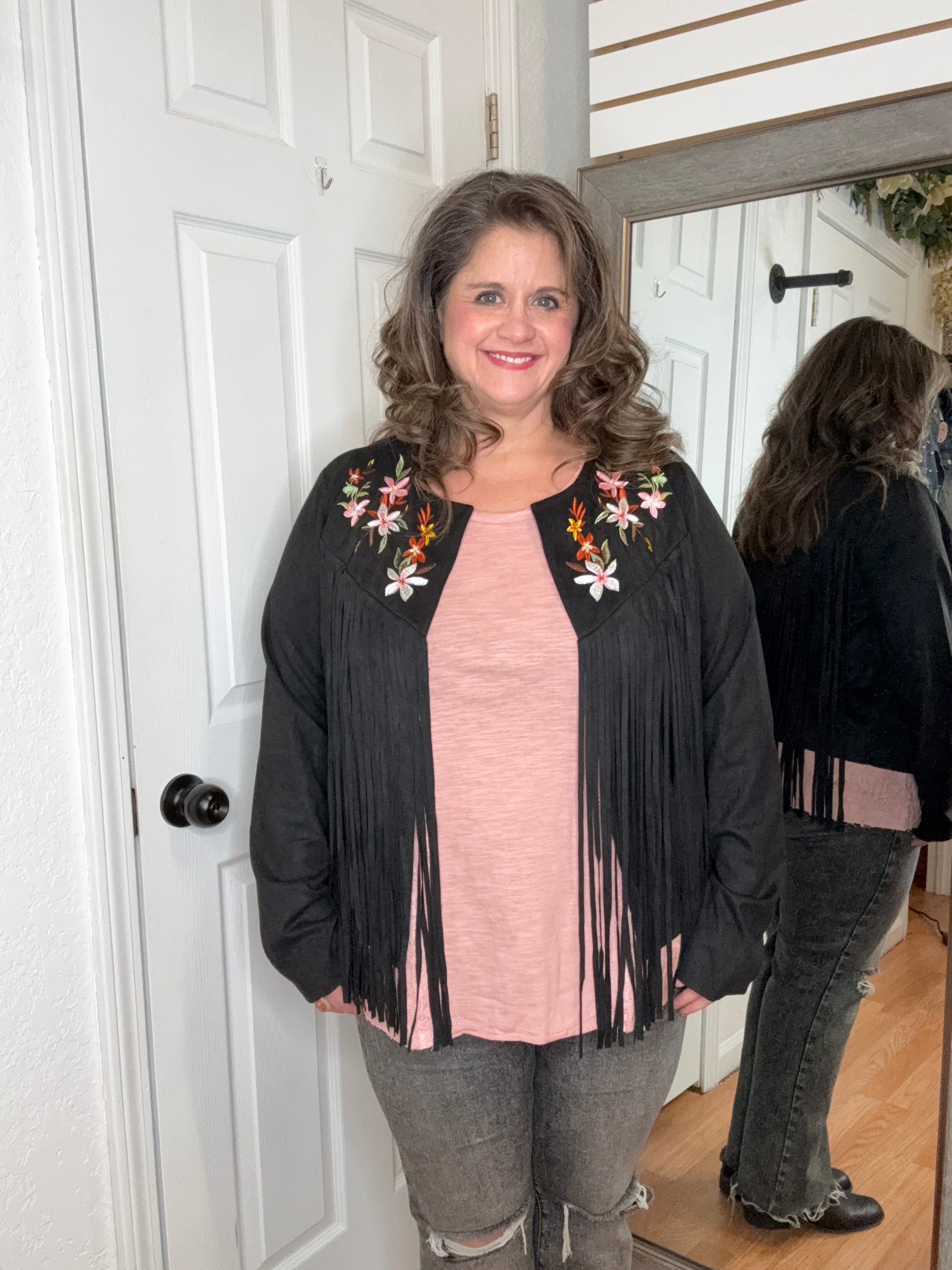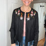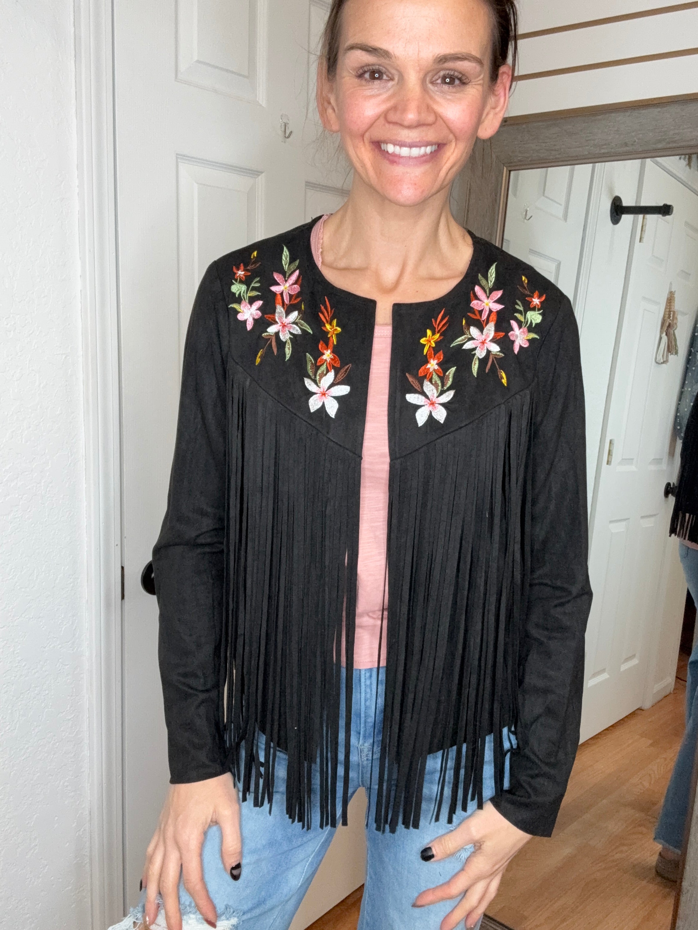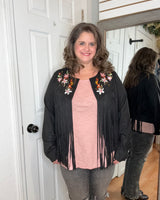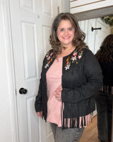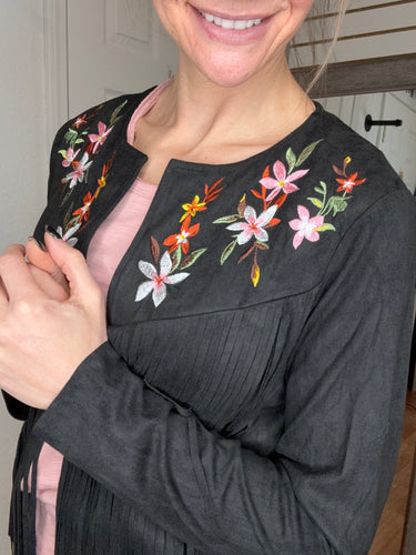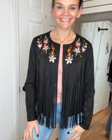 Features: Long sleeve suede fabric layering jacket, with fringe detail. Featuring embroidered colorful florals.